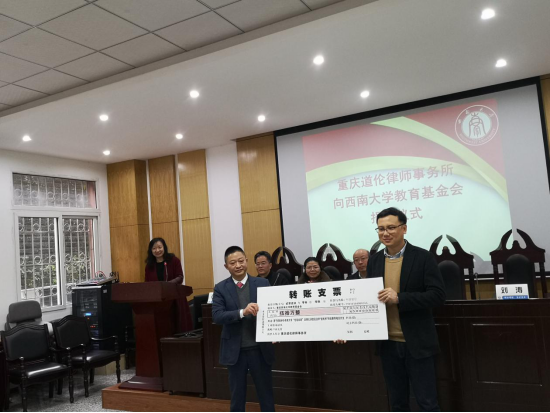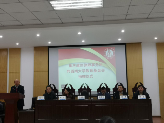 3月8日,重庆道伦律师事务所向学校捐赠50万元,捐赠仪式在法学院举行,重庆道伦律师事务所执行主任李德伦,副主任杨钧携事务所十余位律师出席捐赠仪式。出席仪式的还有学校对外联络部部长、教育基金会秘书长龚常智,法学院党委书记张新民,对外联络部副部长、教育基金会副秘书长刘涛,法学院党委副书记胡建及法学院学生代表。捐赠仪式由法学院副院长房香荣主持。