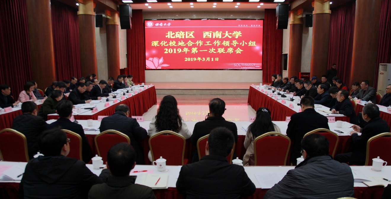 近日,学校与北碚区在学校东方红会议厅召开深化校地合作2019年第一次工作联席会。区委书记周旭,区委副书记、区长何庆,区委副区长赵祺、刘小辉、陈德川,学校党委书记李旭锋,校长张卫国,副校长崔延强、温涛,党委常委罗朝明,校长助理周光明以及相关部门负责人出席会议。张卫国校长主持会议。
