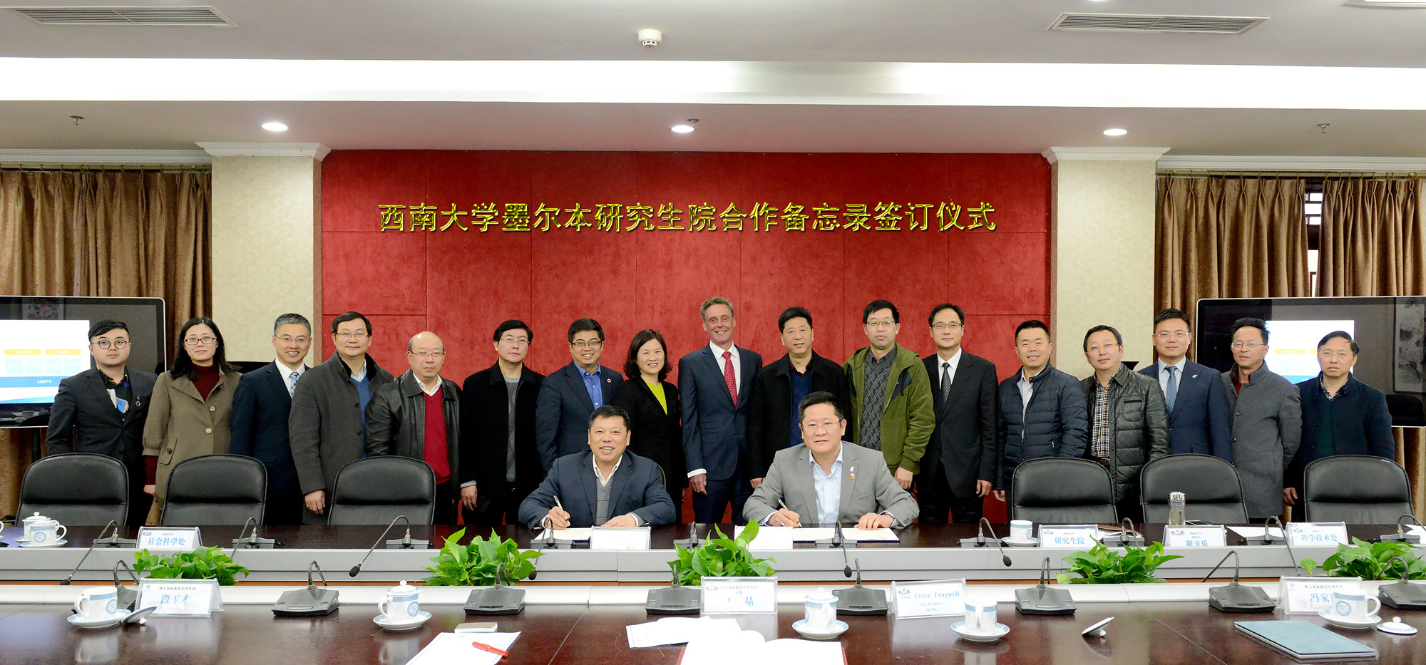 3月14日下午,beat365在线唯一官网登录墨尔本研究生院(MGI)工作推进会暨合作备忘录签约仪式在学校举行。澳大利亚教育管理集团(AEMG)总裁李新庆、总监王晶、副总裁(战略与科研)Peter Frappell教授(塔斯马尼亚大学前副校长),学校校长张卫国、副校长靳玉乐,以及研究生院、科技处、社科处、国际处、对外联络部、教育学部、心理学部、计算机与信息科学学院/软件学院、农学与生物科技学院、动物科技学院、药学院/中医药学院、农业科学研究院、人工智能学院等相关单位主要负责人出席会议。