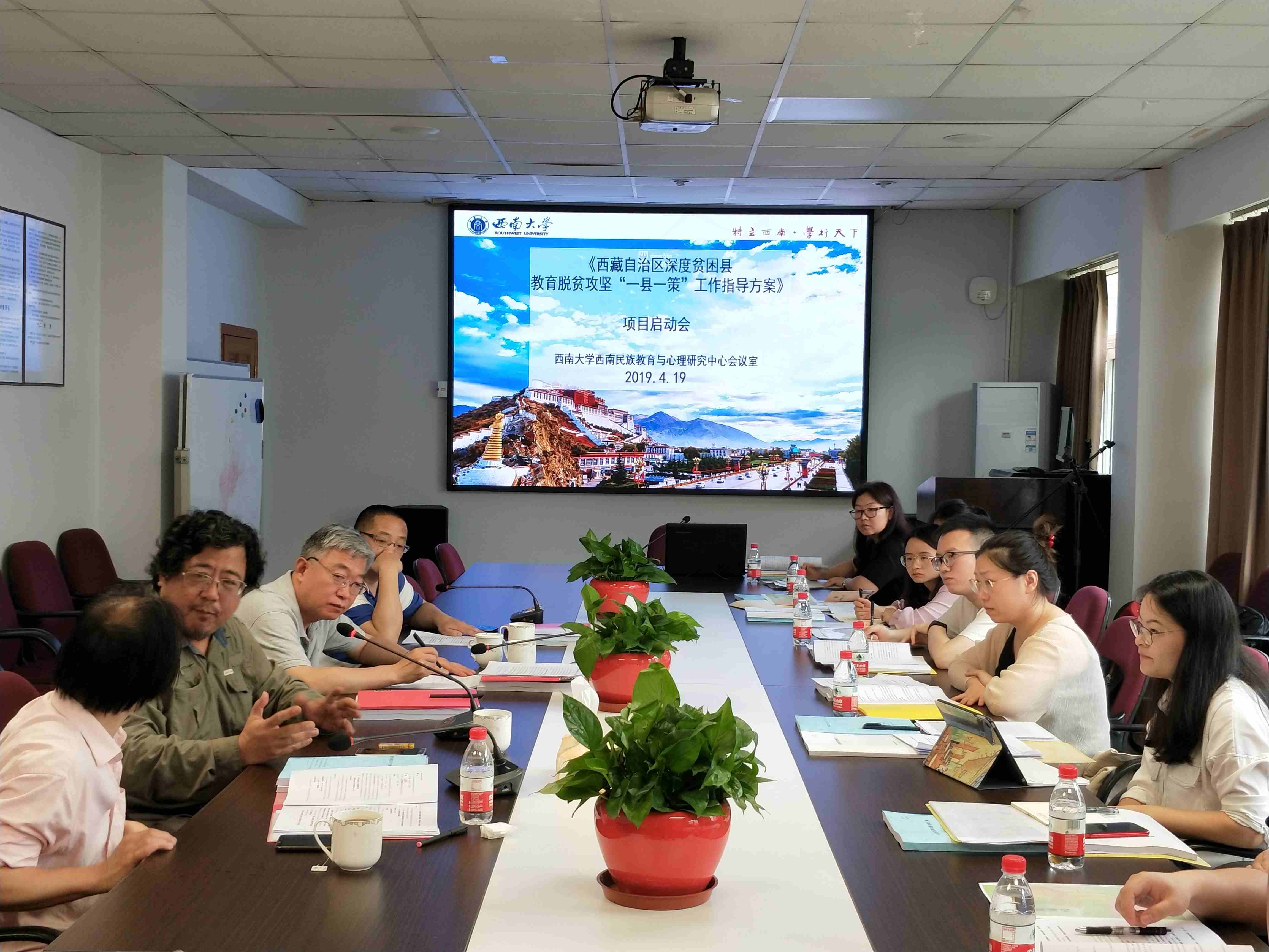 为深入贯彻落实习近平总书记在重庆考察期间主持召开的解决“两不愁三保障”突出问题座谈会上的重要讲话精神,助力教育脱贫攻坚战的最后胜利,学校承接了由教育部民族教育司和教育部民族教育发展中心委托的《西藏自治区深度贫困县教育脱贫攻坚“一县一策”工作指导方案》重大项目任务(以下简称“项目”),并于4月19日在教育部人文社科重点研究基地beat365在线唯一官网登录西南民族教育与心理研究中心(以下简称“中心”)荟文楼537会议室举行项目启动会。会议由中心主任张学敏主持,学校副校长、教育部民族教育发展中心民族教育发展与高层次人才培养重点研究基地(以下简称“基地”)主任崔延强,校医院副院长靳树芝,以及来自中心和教育学部的项目组师生成员参加此次会议。