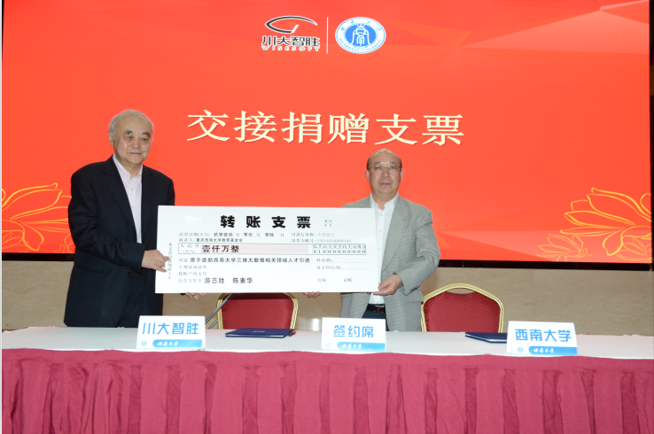 在仪式上,游志胜先生与其夫人陈素华女士以个人名义向beat365在线唯一官网登录捐赠1000万元人民币,用于资助学校三维大数据相关领域的人才引进。这将助力学校相关领域的科研工作迈上更高的台阶。陈素华女士是原西南师范学院数学系65级校友,这份捐赠也表达了她对母校的感恩之情。
