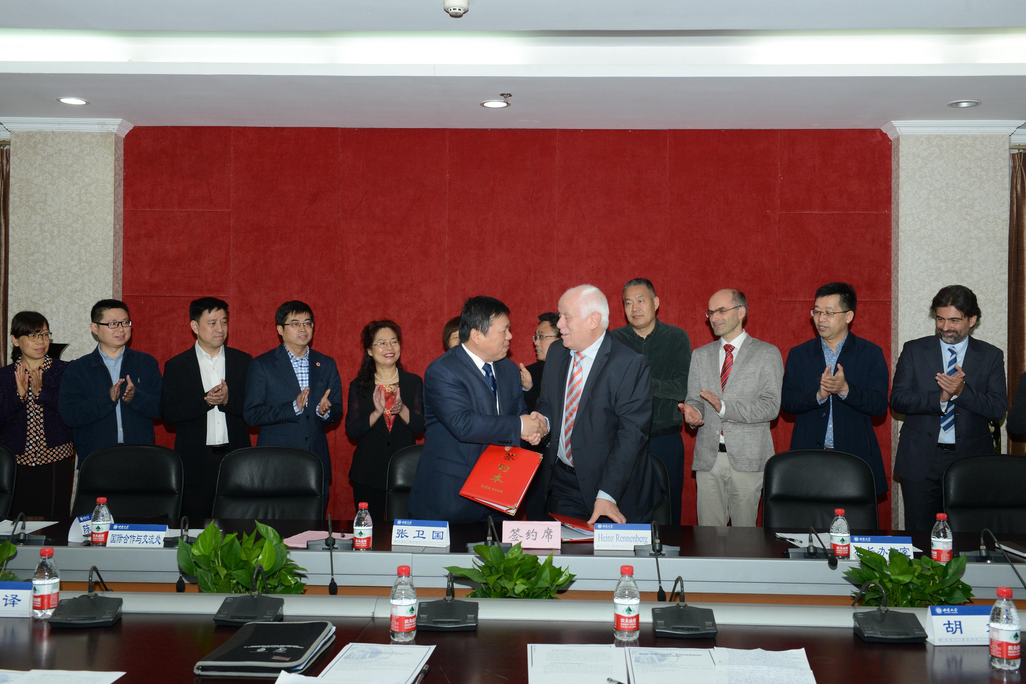 张卫国校长代表学校与海恩斯·莱恩伯格教授及其团队成员罗伯特·汉氏教授、艾玛诺·弗莱梅塔克斯副教授签约。学校党委组织部、党委宣传部 网络工作部、校长办公室、人事处、研究生院、科学技术处、国际合作与交流处、财务处、国有资产管理处、实验室与设备管理处等相关职能部门负责人和资源环境学院师生代表出席了签约仪式。