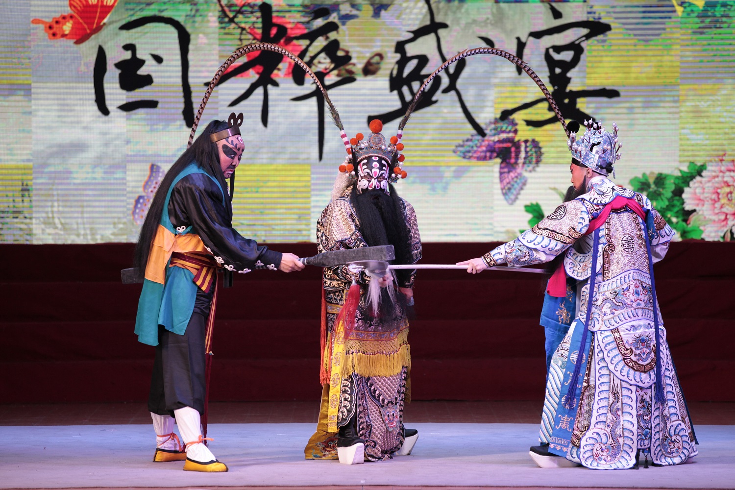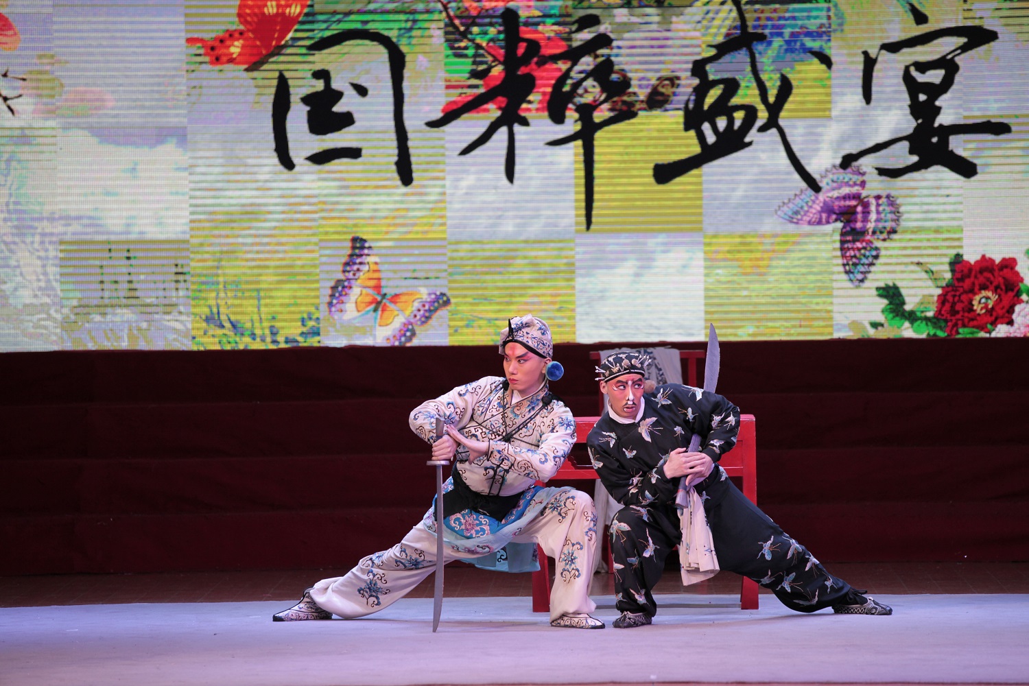 一身黑衣,鼻梁抹白,首先上场的武丑拉开了表演序幕。步履轻盈,动作敏捷,口中唱词风趣,表情生动逗趣,不时引来观众大笑叫好。在这场名为《三岔口》的剧目中,因为误解,为保护焦赞的侠义大将任堂惠在客店中与店老板刘利华打斗起来。由于发生背景是黑夜,两位演员在“黑夜”中上演了精彩的打斗情节,两位分别饰演武生和武丑的演员十分敏捷,功夫精湛,单凭一桌两刀,在舞台上尽显身手。