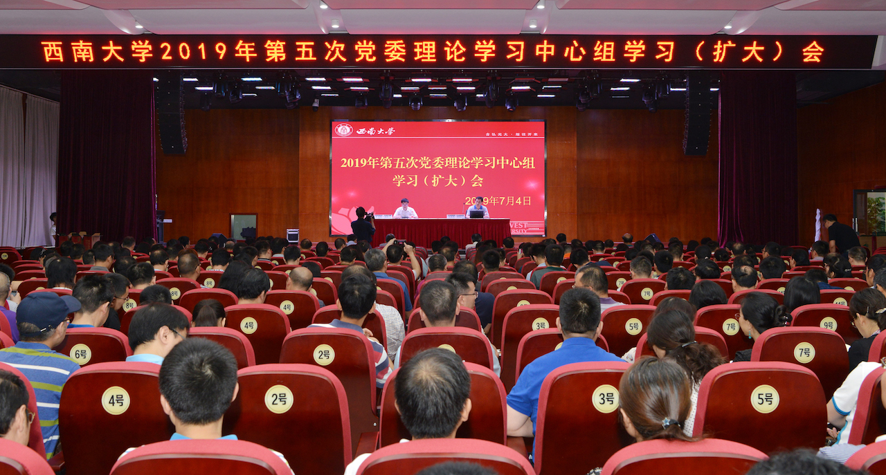 7月4日下午,学校在第二学生活动中心报告厅召开2019年第五次党委理论学习中心组学习(扩大)会,学习贯彻习近平总书记视察重庆重要讲话精神,开展“不忘初心 牢记使命”主题教育宣讲。出席会议的有校领导,党委委员,纪委委员,学校副处级以上干部。会议由学校党委书记李旭锋主持。
