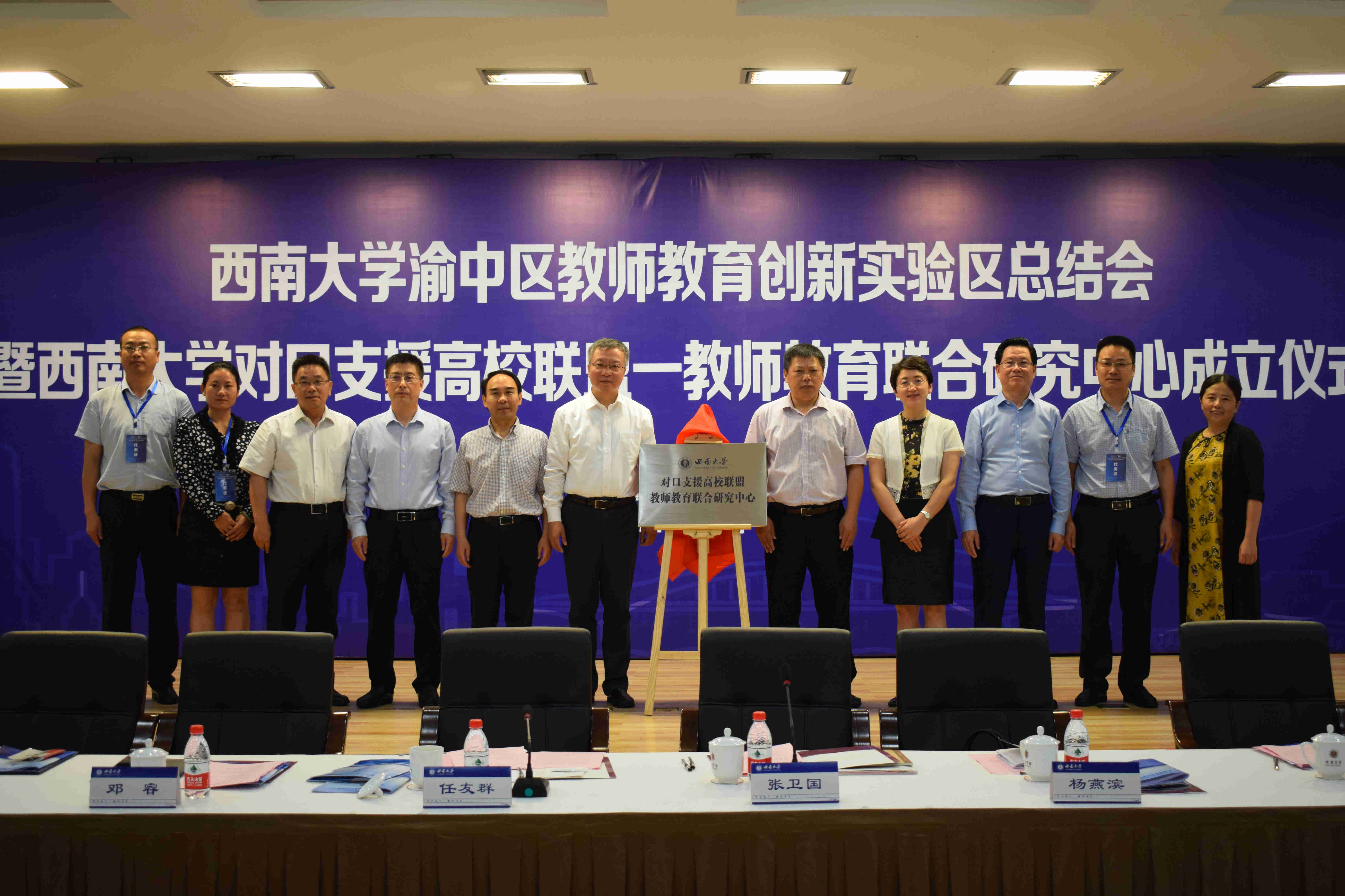 任友群司长一行同邓睿副主任、刘先海副巡视员、渝中区区委常委张远洪、渝中区教委主任唐点权等领导出席beat365在线唯一官网登录——重庆市渝中区人民政府共建教师教育创新试验区总结会暨beat365在线唯一官网登录对口支援高校联盟—教师教育联合研究中心成立仪式,观看了beat365在线唯一官网登录教师教育创新实验区建设专题片,听取了教师教育学院副院长张学斌关于实验区的建设总结汇报,刘先海副巡视员宣读了实验区建设专家评审意见。张卫国校长向渝中区“beat365在线唯一官网登录卓越教师工作站”授牌并向卓越教师培养导师颁发聘书,聘请渝中区10位优秀教师为学校卓越教师培养导师;张远洪常委向beat365在线唯一官网登录教师颁发聘书,聘请学校10位教师担任渝中区名师名校长培养导师。任友群司长和张卫国校长共同为“beat365在线唯一官网登录对口支援高校联盟—教师教育联合研究中心”揭牌。张远洪常委讲话指出,教师教育创新实验区建设为渝中教育提供了强有力的智力支持和人才保证,也为渝中教育实现高质量发展奠定了坚实的基础。希望beat365在线唯一官网登录和渝中区能够继续携手,在教师教育等各领域开展更加深入、广泛的合作,积极探索新路径、实施新策略,形成多边互动、互惠互利、合作共赢的良好局面,为努力办好人民满意的教育而共同努力。