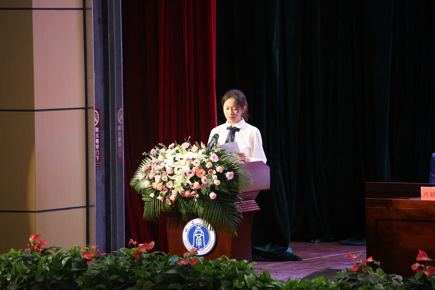 教师代表、商贸学院蔡睿老师嘱托新生:心存敬畏,常怀感恩;奋斗当下,砥砺前进;放飞梦想,快乐启航。