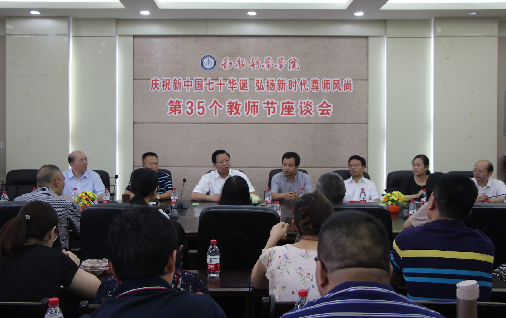 曹清尧书记一行首先来到校区第二教学楼,看望慰问了动物科学学院甘玲教授,基础部陈朝辉博士等教师代表,为他们送上节日祝福。随后,曹清尧书记一行来到动物科学学院庆祝第35个教师节座谈会现场,参加交流座谈,曹清尧书记指出,学校荣昌校区历史悠久,广大教师潜心教书育人、科学研究、服务地方,培养了一大批优秀人才,推动了荣昌的经济发展,为荣昌乃至国家的畜牧业做出了重要贡献。他表示,荣昌区将继续大力支持校区办学,积极推动学校朝着世界一流大学迈进。