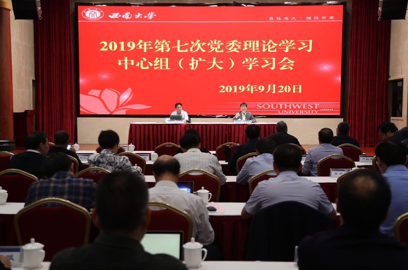 9月20日上午,学校召开第七次党委理论学习中心组(扩大)学习会,开展“不忘初心、牢记使命”主题教育专题报告。全体校领导、党委委员、纪委委员参加专题学习。党委书记李旭锋主持会议。