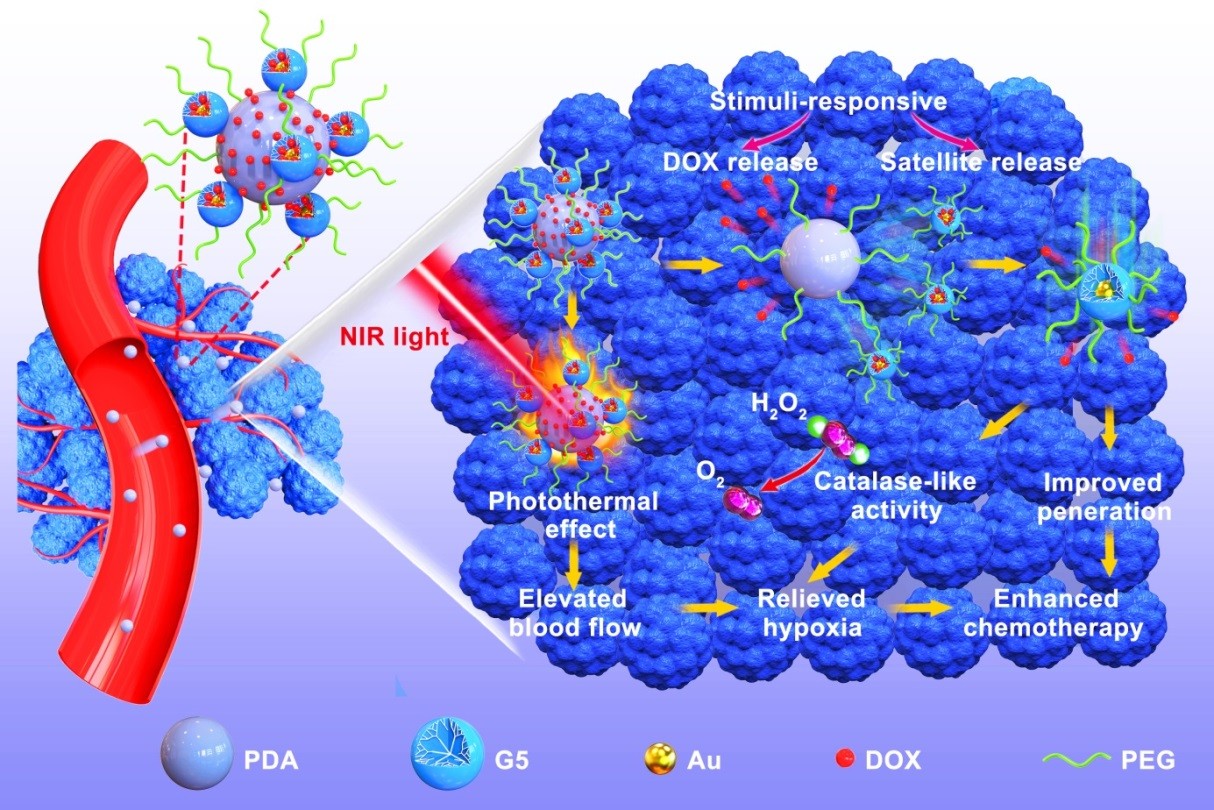 化学治疗是临床医学上广泛使用的一种肿瘤治疗手段。所用化学药物必须到达肿瘤部位,才能充分发挥其治疗效果。但由于大多数抗癌药物自身的性质(如血池代谢速度快和水溶性差等)和实体瘤本身的特点(如乏氧和间质密度过高等),治疗往往很难达到预期效果。为了提高治疗效果,刘辉副教授课题组设计并构建了“核-卫星”结构的载药聚多巴胺/树状大分子-金复合纳米颗粒。所制备的PDA-G5Au-PEG@DOX复合纳米颗粒在肿瘤部位可响应偏酸的微环境释放“卫星”G5Au纳米颗粒,实现肿瘤深处药物递送。同时金纳米颗粒表现类过氧化氢酶活性,原位催化过氧化氢分解产生氧气,降低乏氧环境产生的耐药性。除此之外,复合纳米颗粒负载的抗癌药物阿霉素可在内部(酸和过氧化氢)和外部(近红外光)刺激下特异性定点释放。该复合纳米颗粒可以响应近红外光,对肿瘤部位实现光声诊断和光热治疗。动物实验表明,所制备的复合纳米颗粒不仅具有良好的生物相容性,并且可通过联合治疗显著抑制肿瘤生长。