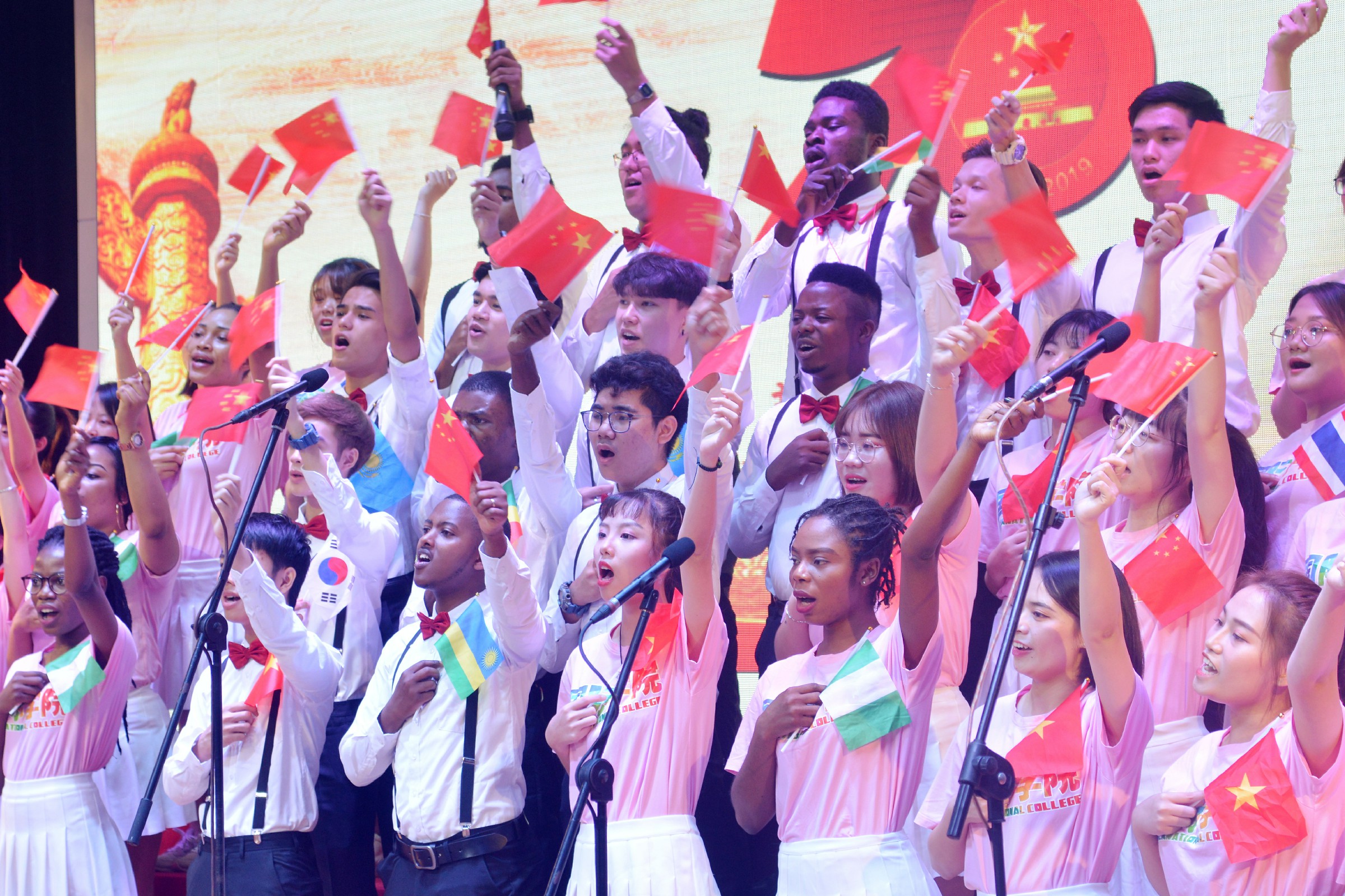 激情饱满的演唱将观众的热情带动起来,纷纷轻声跟唱、用手机锁定这一刻的精彩。表演结束后,来自国际学院的留学生合唱团带来《友谊地久天长》和《我和我的祖国》两首歌曲大合唱。台下观众自发起立,留学生们挥动手中的五星红旗和各个国家的国旗,台上台下共唱一首歌,将演出气氛推向高潮。比赛在音乐学院教职工合唱团带来的表演曲目《人民丹心》和《绣红旗》的歌声中落下帷幕。
