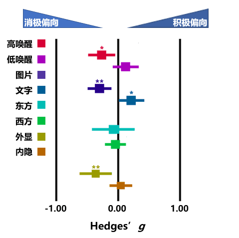 在此基础上,研究团队对38项研究中的49个实验结果进行了元分析。结果表明高唤醒刺激、场景/图片刺激和外显的情绪判断更容易导致消极情绪偏向,而文本类的刺激有利于降低消极情绪的敏感性从而促进积极情绪效应的发生。这些结果对个体在现实生活中,如何通过选择不同的刺激情境实现无需费力的情绪调节具有重要的指导意义。