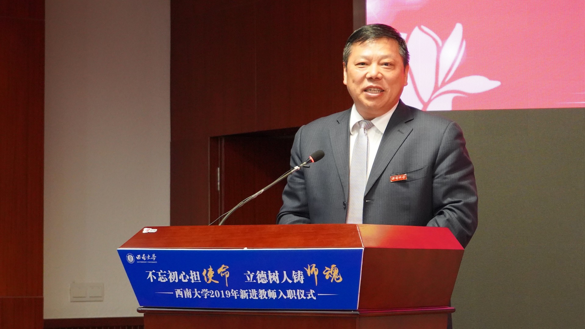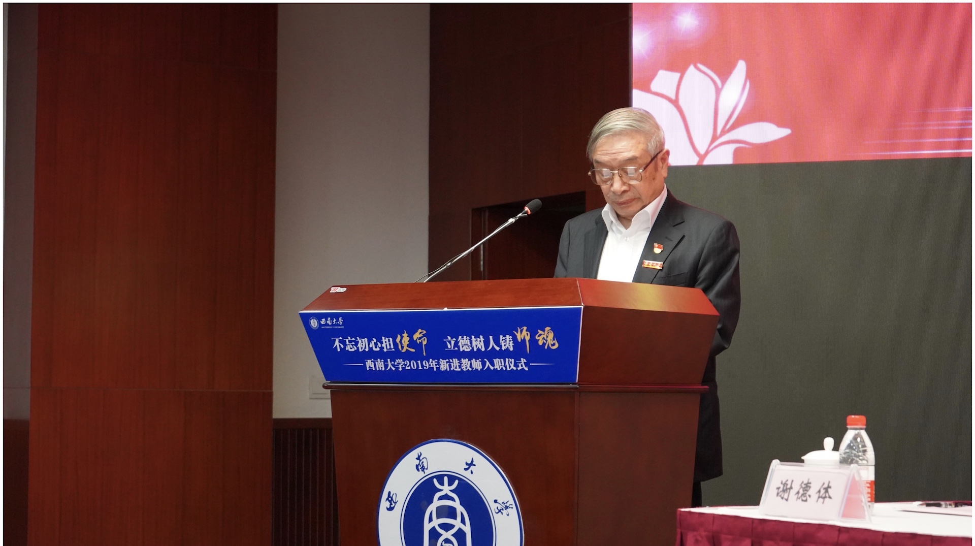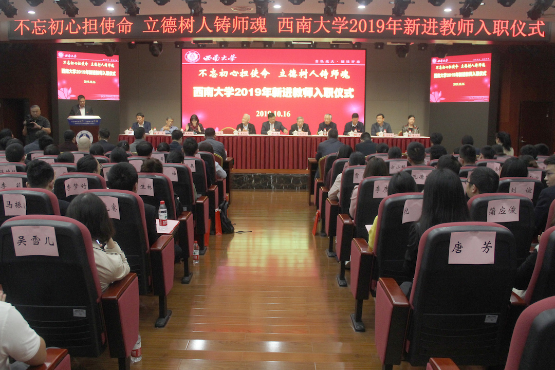 10月16日下午,学校在档案馆多功能报告厅举行2019年新进教师入职仪式。校长张卫国,向仲怀院士,袁道先院士,黄希庭教授,副校长陈时见、靳玉乐,赵伶俐、裴炎、王本朝、谢德体、董小玉等学校部分优秀教师代表,学校各职能部门负责人出席仪式。仪式由陈时见副校长主持。