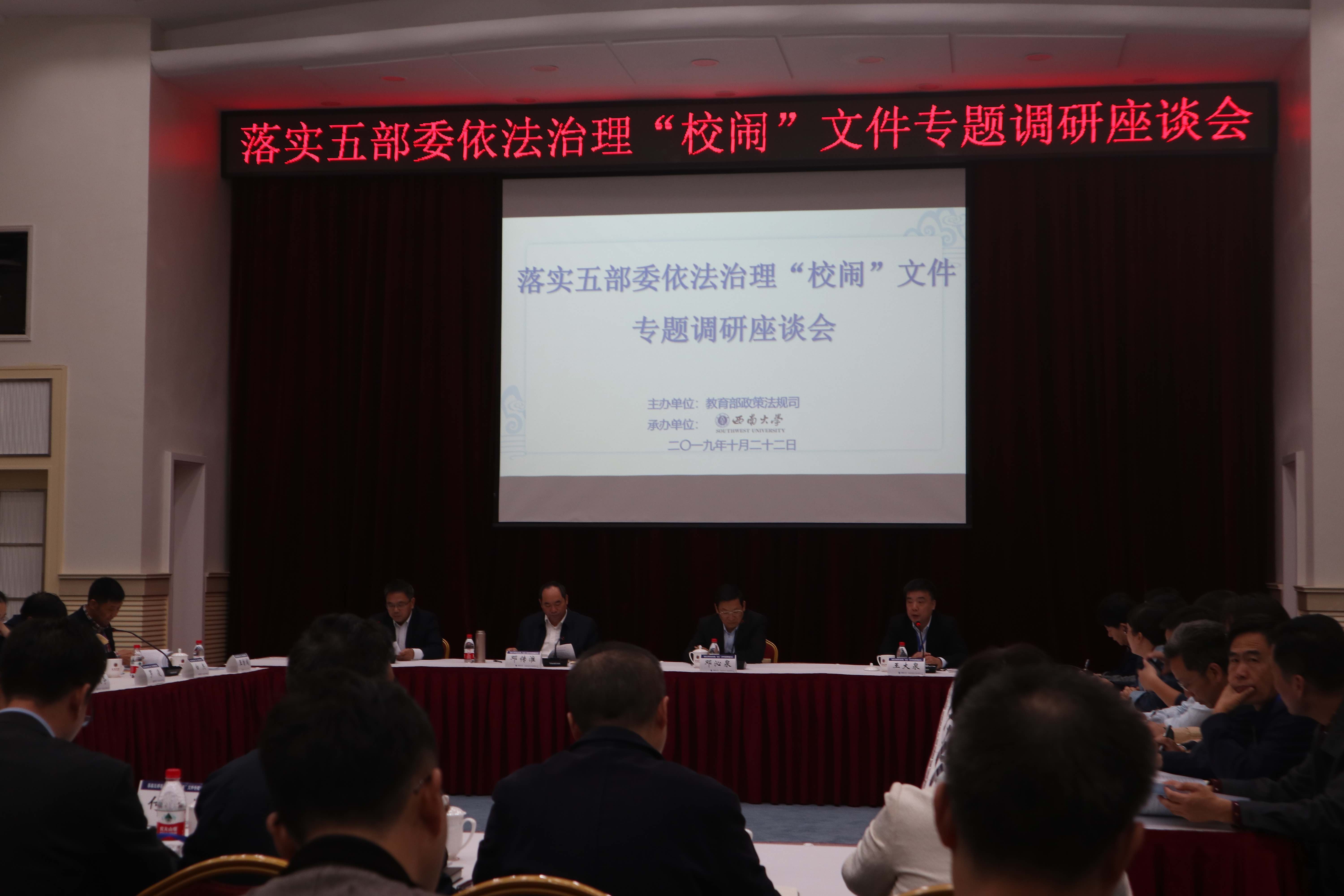 10月22日,由教育部政策法规司主办、beat365在线唯一官网登录承办的落实五部委依法治理“校闹”文件专题调研座谈会在校举行。教育部政策法规司司长邓传淮、学校副校长陈时见、重庆市教委副主任邓沁泉出席会议并致辞。教育部政策法规司副司长王大泉主持调研座谈会。