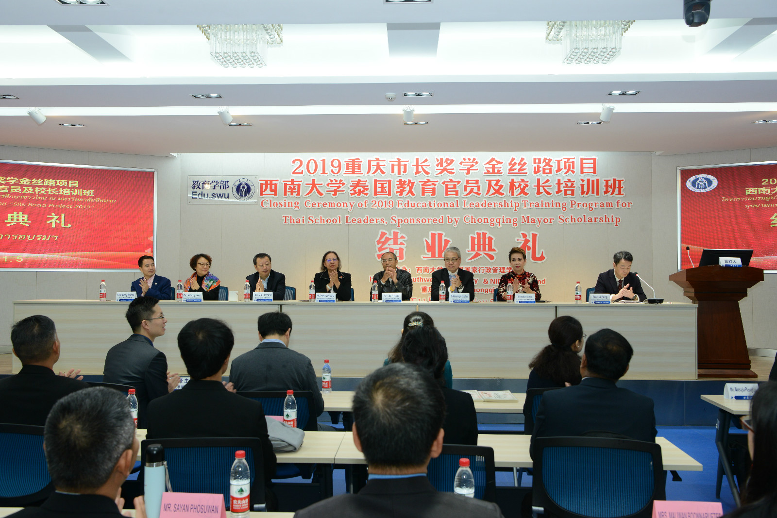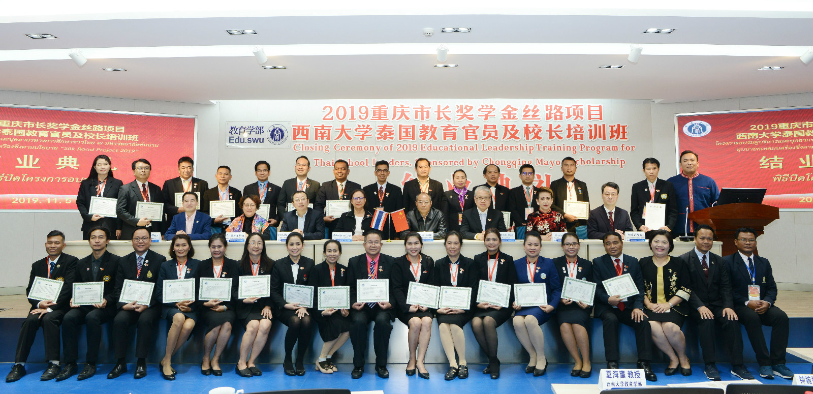 11月5日上午,2019年重庆市长奖学金丝路项目---“beat365在线唯一官网登录泰国教育官员及校长培训班”结业典礼在教育学部举行。泰国教育部次长杜丽亚、泰国教育行政管理学院院长萨蔡童、beat365在线唯一官网登录校长助理褚远辉、教育学部部长朱德全、国际学院院长王静出席典礼,项目班主任和相关工作人员,以及30位来自泰国的教育官员与职业院校、中小学校长参加典礼。