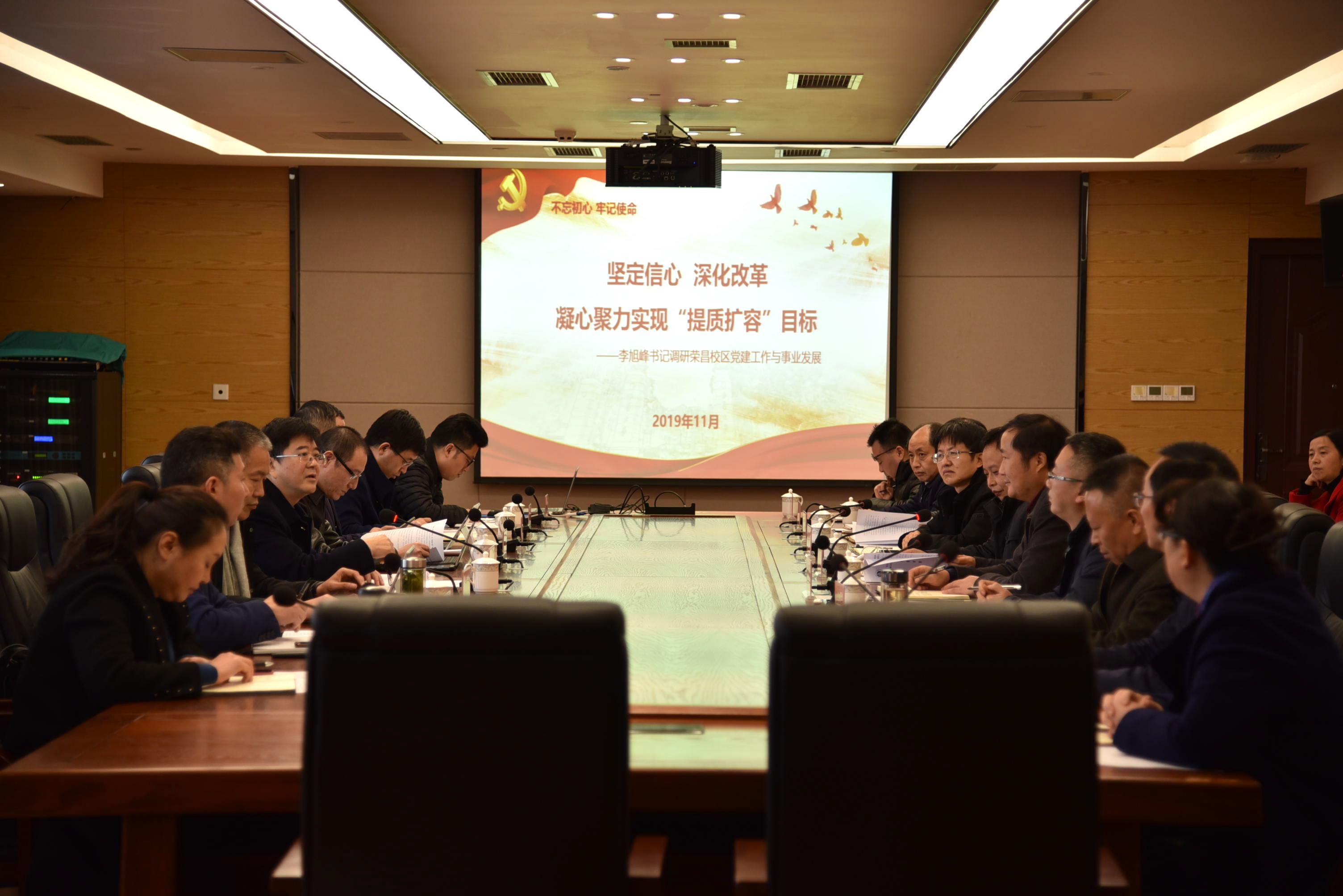 为深入贯彻党的十九届四中全会精神,扎实开展“不忘初心、牢记使命”主题教育,落实学校第三次党代会精神,11月21日,学校党委书记李旭锋带队到荣昌校区调研,深入考察了荣昌校区党建和事业发展情况。荣昌校区相关负责人参加调研会,并汇报工作情况。