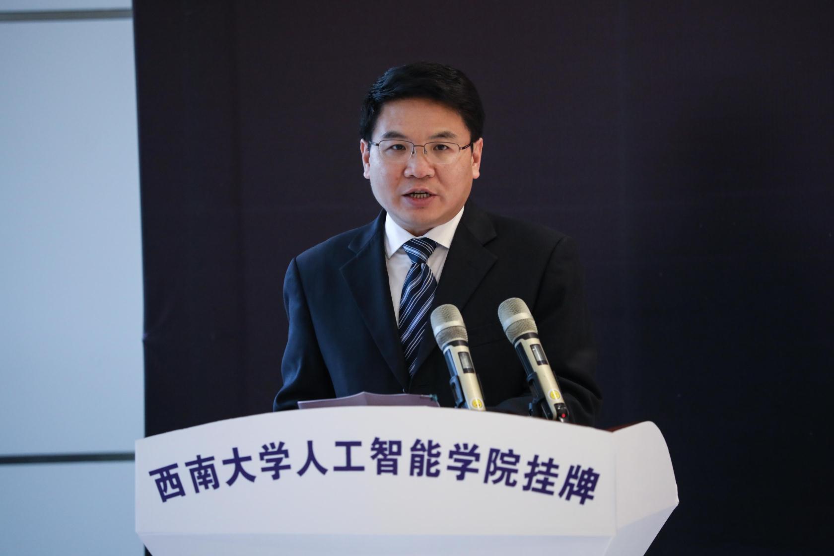 张卫国校长代表学校对在场领导和嘉宾表示热烈欢迎和衷心感谢,介绍了学校人工智能发展的基本情况和学校在基础教育方面所做的工作。张卫国校长指出,学校深刻的认识到作为地属重庆的大学想要坚持扎根中国大地办教育,首先必须要坚持扎根巴渝大地,积极服务重庆当地经济社会发展。当前,学校正在深入贯彻落实习近平总书记对重庆提出的“两点”定位、“两地”“两高”目标、发挥“三个作用”的重要指示精神,积极实施助力重庆行动计划。希望通过区校双方的精诚合作、共同努力,为重庆实现高质量发展,创造高品质生活贡献力量。