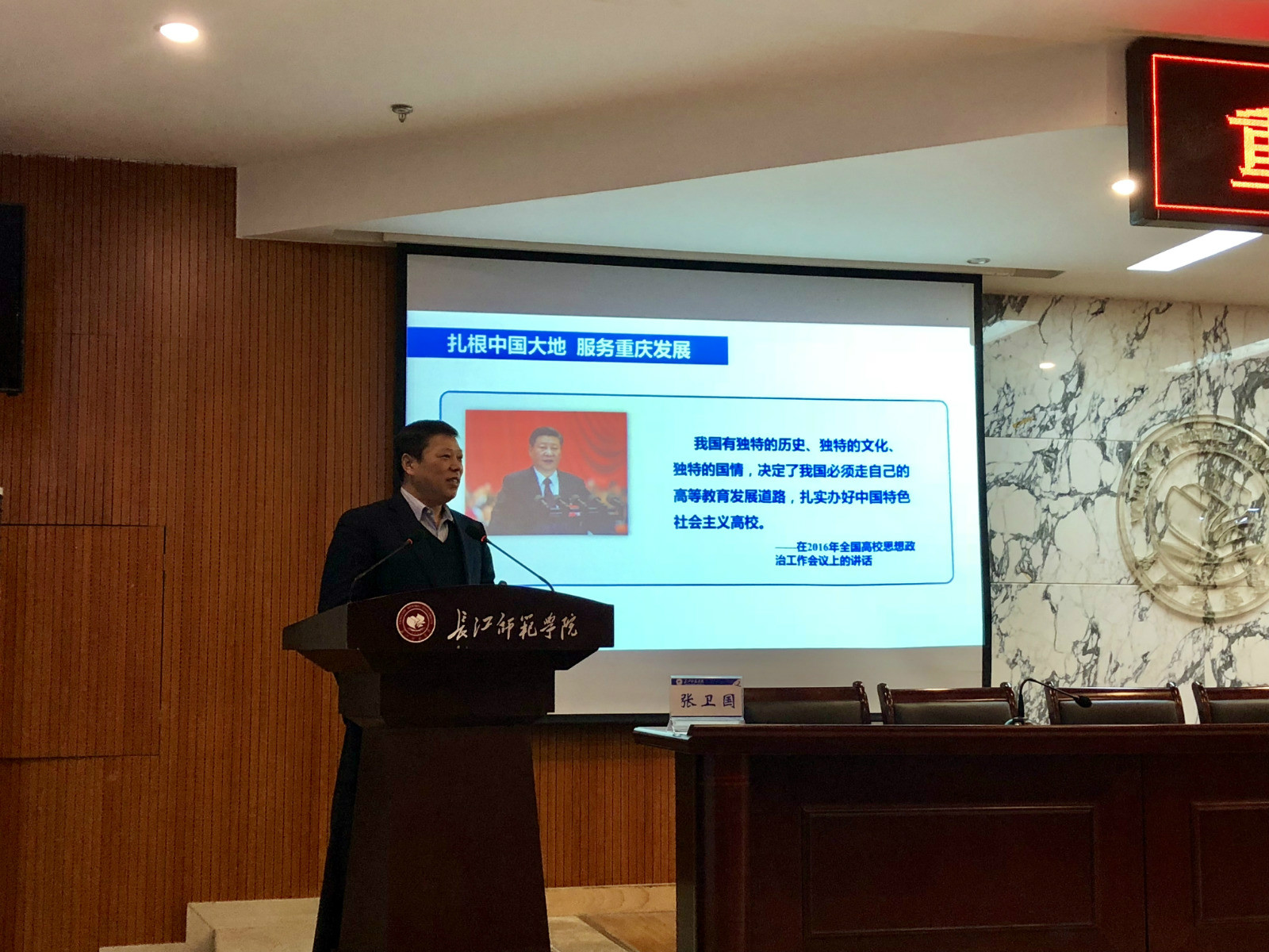 张卫国校长从世界大学职能的历史演变及服务对象的历史变迁中揭示了中国大学的职能及服务对象,他认为,中国特色社会主义大学应具备“人才培养、科学研究、社会服务、文化传承创新、国际交流合作”五项职能,大学的发展要为人民服务、为巩固和发展中国特色社会主义制度服务、为中国共产党治国理政服务、为改革开放和社会主义现代化建设服务。张卫国校长指出,重庆高等教育应服务于新时代重庆的“两点定位”“两地两高”目标和“三个作用”,各高校应在重庆的区位优势、生态优势、产业优势和体制优势下,把市委市政府的“三大攻坚战”和“八项行动计划”作为自身服务定位。