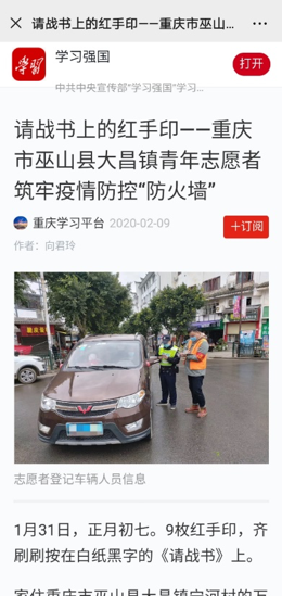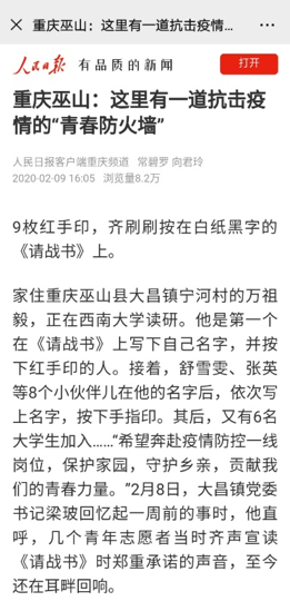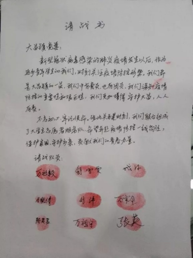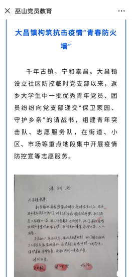 学校地理科学学院研究生万祖毅,家住重庆巫山县大昌镇宁河村。新型冠状病毒肺炎疫情爆发以来,他时刻关注着家乡疫情防控的相关情况,主动与宁河村支书联系,表达想参与疫情防控工作的意愿。1月31日,万祖毅着手组建青年志愿者服务队,向大昌镇党委郑重递交《请战书》——“希望奔赴疫情防控一线岗位,为保护家园、守护乡亲,贡献我们的青春力量。”