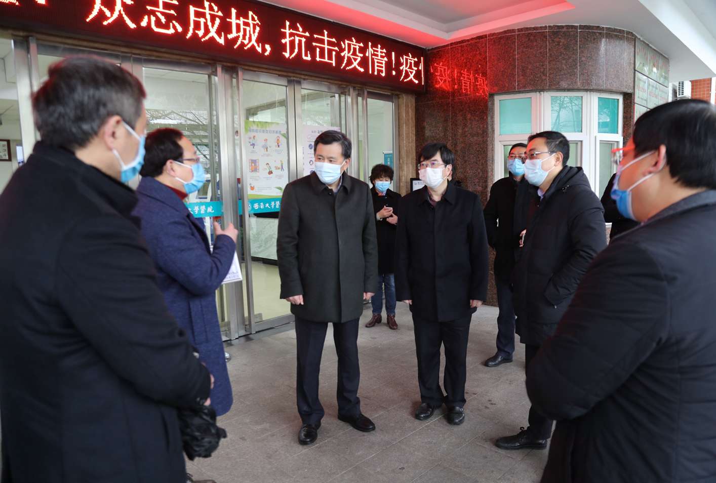 2月15日下午,北碚区委书记、疫情防控工作总指挥长周旭一行来校检查指导疫情防控工作。北碚区委副书记、区长、疫情防控工作执行指挥长何庆,区委常委、宣传部部长、疫情防控工作副指挥长江绪容,区委常委、政法委书记、疫情防控工作副指挥长苟鹏参加检查。学校党委书记、疫情防控指挥部总指挥李旭锋,党委副书记、疫情防控指挥部副总指挥潘洵,副校长、疫情防控指挥部副总指挥崔延强,党委常委、组织部部长杨爱华,党委常委、宣传部部长李荣华等陪同检查。