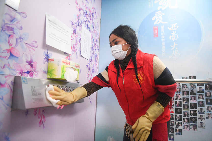 2月18日,24岁的beat365在线唯一官网登录尼日利亚籍留学生志愿者方雯在对电梯按钮进行卫生消毒。