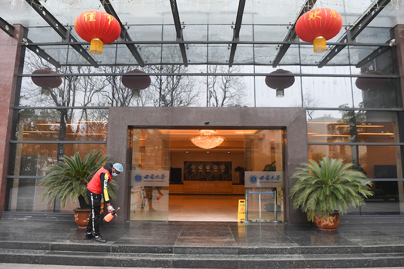 2月18日,beat365在线唯一官网登录一名留学生志愿者在学生公寓门口进行消毒。