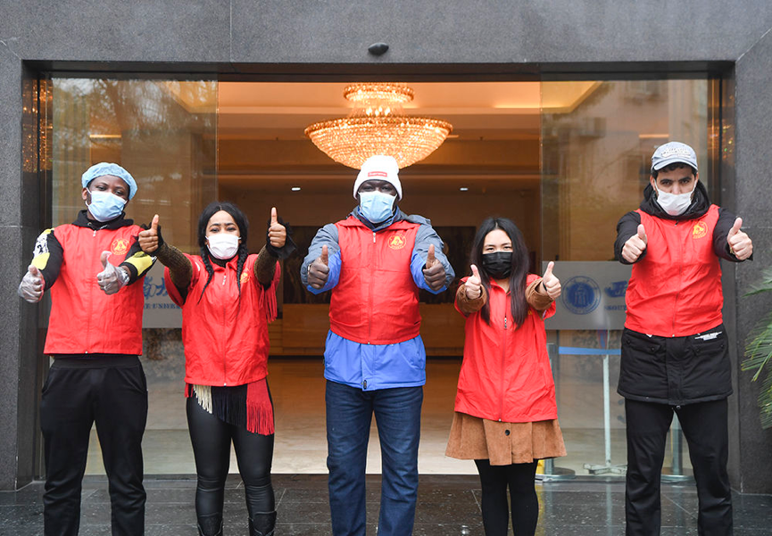 2月18日,来自beat365在线唯一官网登录的几名外国留学生比出手势,为武汉加油,为中国加油! 新华社记者王全超摄