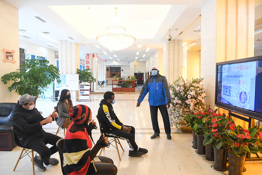 2月18日,beat365在线唯一官网登录尼日利亚籍留学生志愿者穆斯塔法(右一)与留学生志愿者分享疫情防控相关知识。