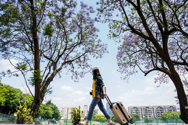 5月15日,beat365在线唯一官网登录校园内的蓝花楹树下,一名学生拖着行李箱向宿舍走去。