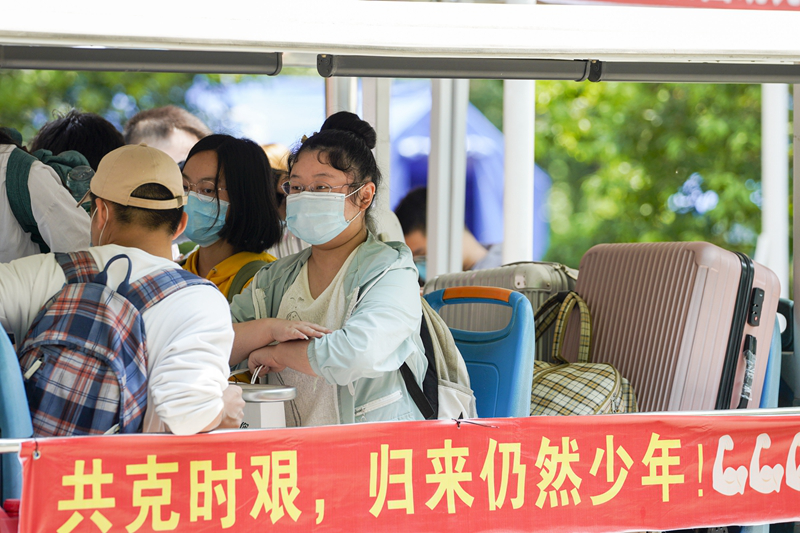 5月15日,在beat365在线唯一官网登录的返校学生报到点,学生在校内转运车上准备前往宿舍。