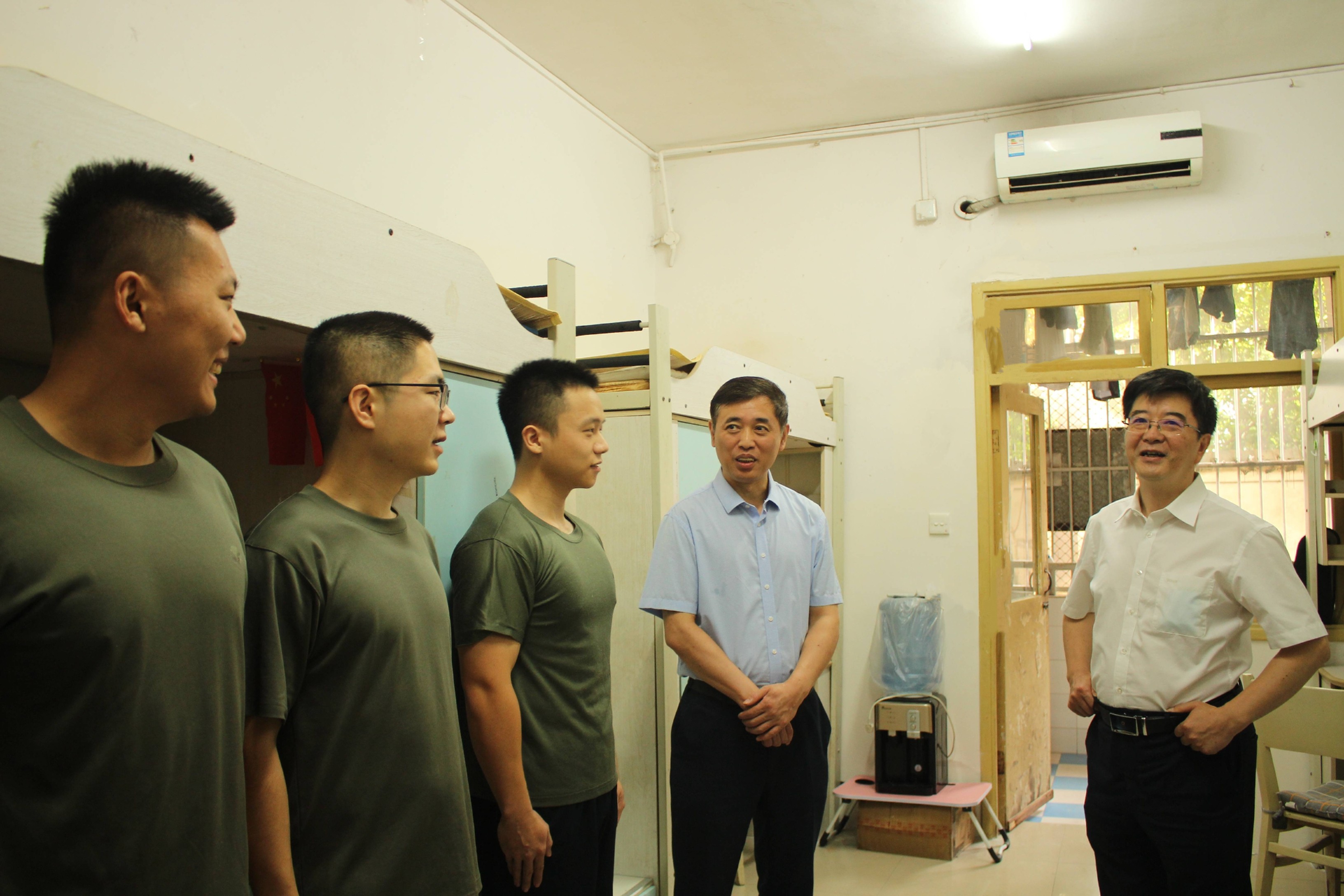 8月17日上午,学校党委书记李旭锋、党委副书记潘洵来到竹园二区二舍,看望即将出征的最后一届毕业国防生并为他们送行。