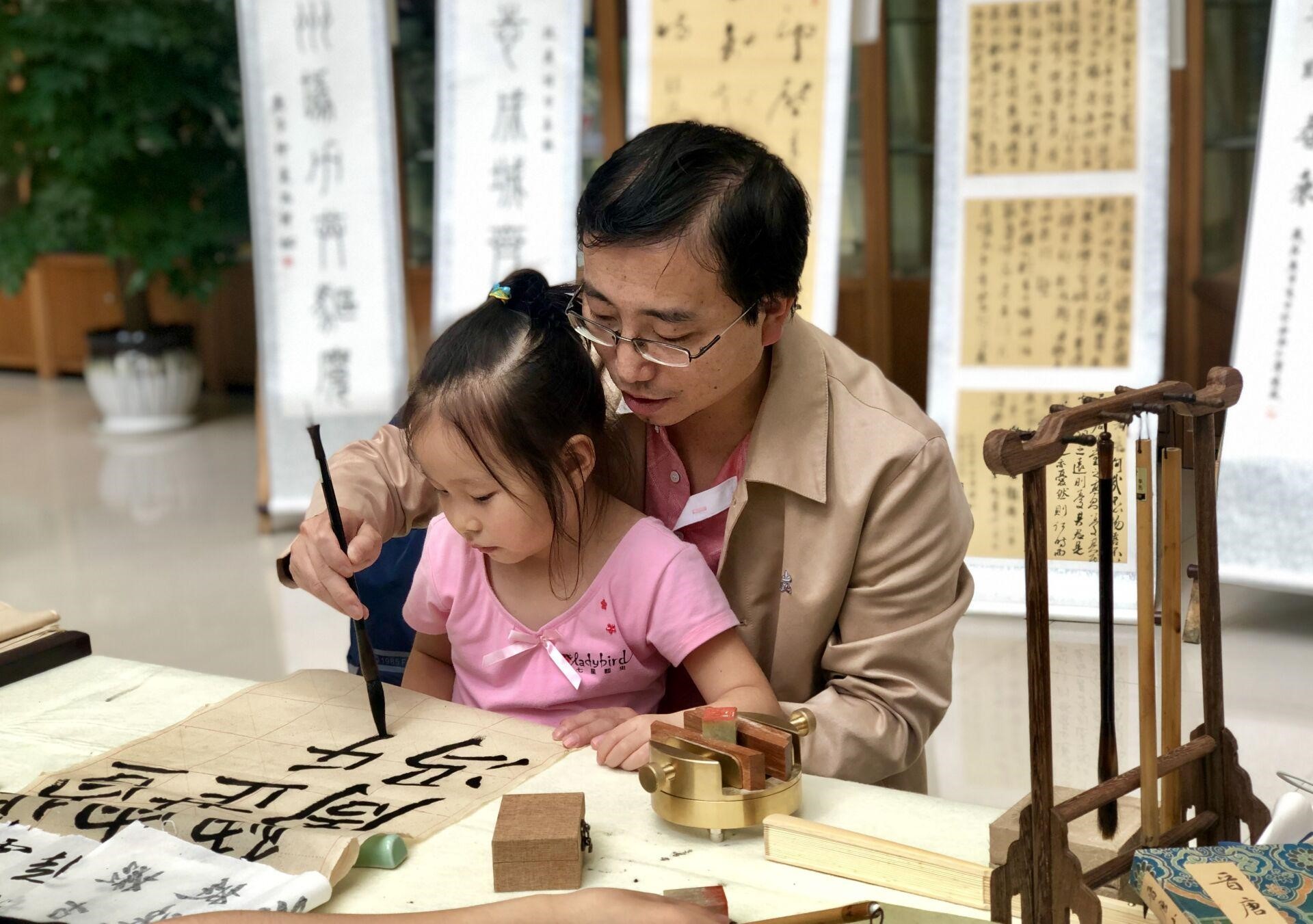活动期间,一对特地前来的父女引人注目。父亲手把手地教授女儿书写毛笔字,这位父亲表示,去年的书法展览他就带着女儿来参加了,参与书法展让孩子在行云流水的书法中去感受传统文化的魅力。