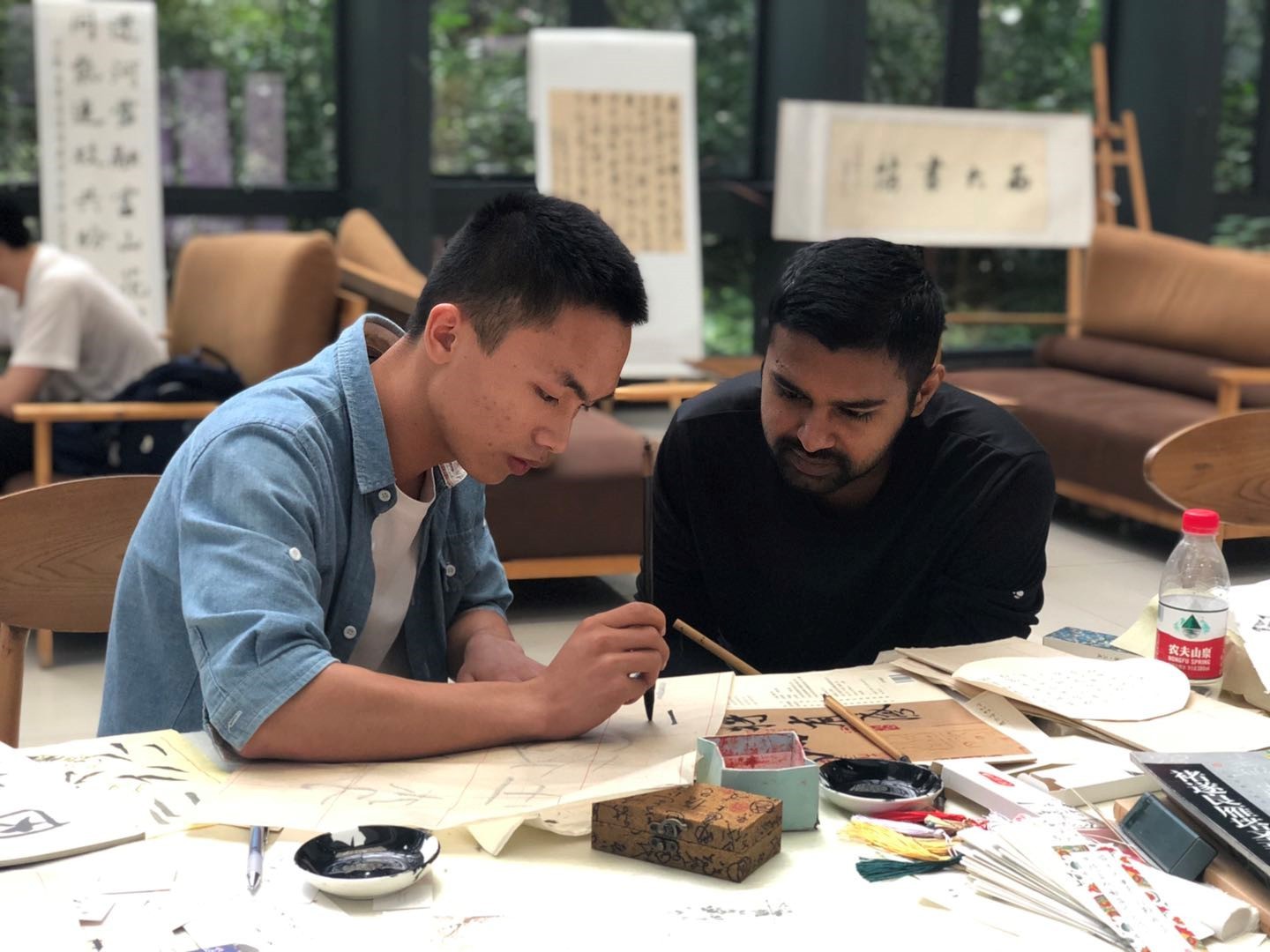 展览的第一天,众多新生前来中心图书馆参观,在书法协会成员的指导下,为自己刚刚启航的大学生涯写下了第一幅作品。除新生外,对书法感兴趣的老生、留学生也参与其中。