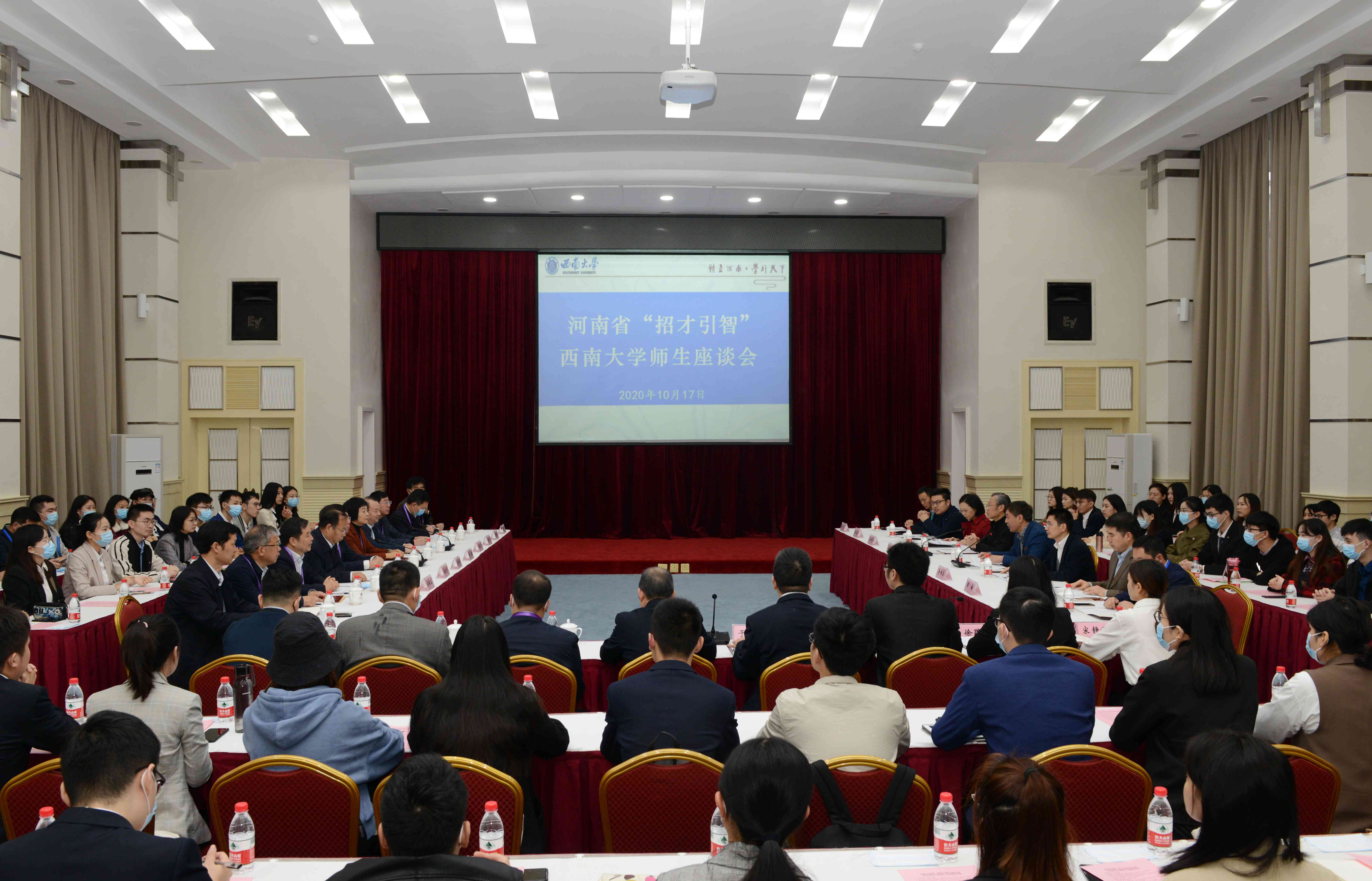 开幕式前,学校在桂圆宾馆金桂厅召开河南省招才引智beat365在线唯一官网登录师生座谈会,学校党委副书记安春元、潘洵,河南省人力资源和社会保障厅厅长刘世伟一行,学校相关职能部门负责人,校内河南籍专家教授代表于泽元教授、丁伟教授,有意向前往河南就业的毕业生60余人参加座谈。安春元在座谈会上介绍了beat365在线唯一官网登录发展概况,刘世伟介绍了河南发展情况和招才引智优惠政策,于泽元教授、丁伟教授,毕业生代表分别发言。潘洵主持座谈会。