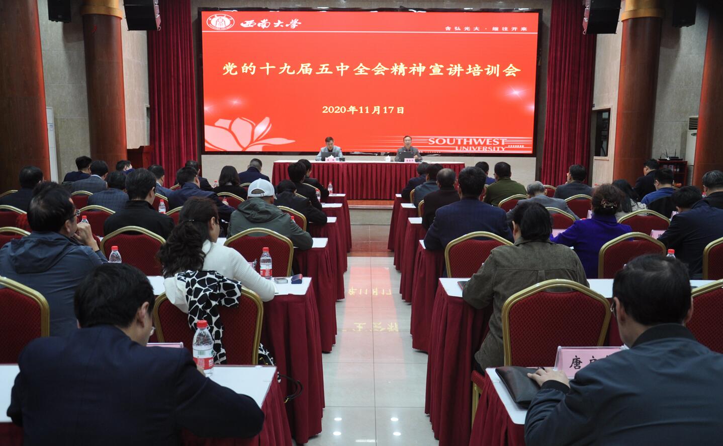 为推动党的十九届五中全会精神学习宣讲全覆盖,进一步把学习教育引向深入,提升学习实效,11月17日下午,学校在东方红会议厅召开十九届五中全会精神宣讲培训会,学校宣讲团成员和二级党组织书记参加会议。学校党委副书记潘洵,党委常委、党委宣传部部长、党委网络工作部部长李荣华出席会议。