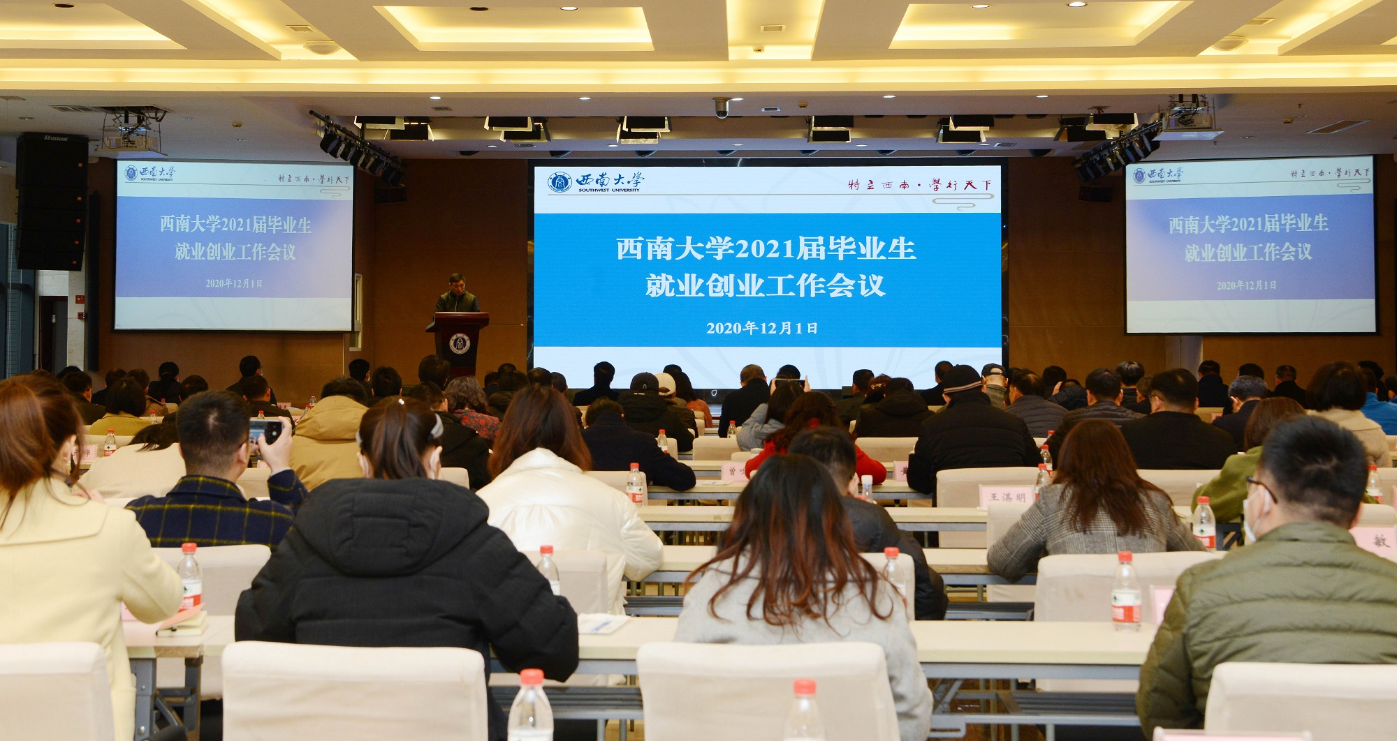12月1日上午,教育部、人力资源社会保障部共同召开2021届全国普通高校毕业生就业创业工作网络视频会议,深入学习贯彻党的十九届五中全会精神,部署做好2021届高校毕业生就业工作。教育部副部长翁铁慧、人力资源社会保障部副部长李忠出席会议并讲话。学校在国际学院报告厅设分会场,党委书记李旭锋、校长张卫国、党委副书记潘洵、副校长王进军及毕业生就业创业工作领导小组成员单位负责人、各学院(部)主要党政领导、分管就业工作副书记、毕业年级辅导员、就业工作职能部门全体工作人员共170余人参加会议。