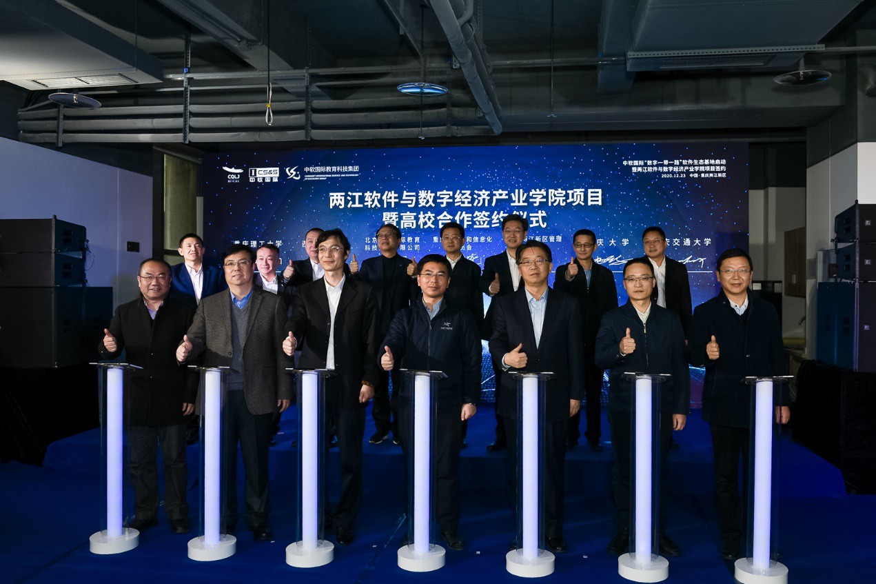 12月23日,中软国际“数字一带一路”软件生态基地启用暨两江软件与数字经济产业学院项目签约仪式在重庆两江数字经济产业园举行。重庆市委常委、两江新区党工委书记、管委会主任段成刚,两江新区党工委副书记、管委会常务副主任王志杰,中软国际有限公司董事会主席陈宇红等出席签约仪式。副校长王进军应邀出席,并代表学校与中软国际签署校企产学研合作协议。
