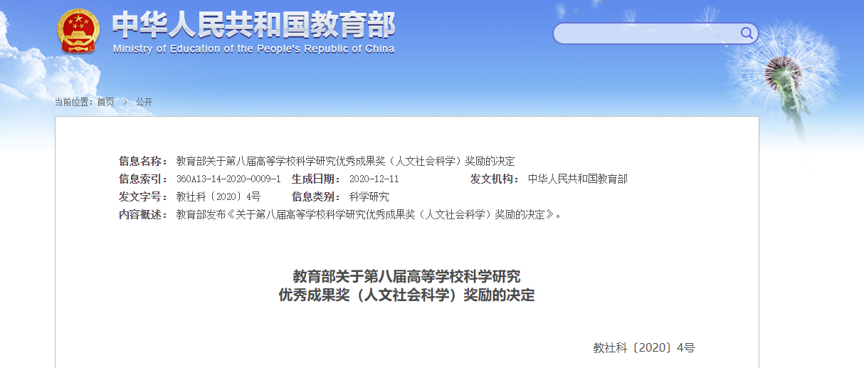据悉,开展高校科学研究优秀成果奖(人文社会科学)评奖工作,是教育部为表彰奖励高校哲学社会科学工作者取得的突出成绩,展示高校社科界服务党和国家事业发展的重大理论与实践成果,推动高校加快构建中国特色哲学社会科学的重大举措,该奖项自1995年设立,每三年评选一次,至今已成功举办八届,共有5667项优秀成果获奖,评选了一大批为党和人民述学立论、建言献策的标志性成果。