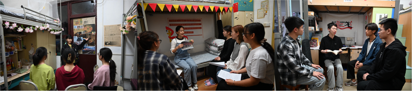 “1921年8月初的一个清晨,天初亮,王会悟就匆匆赶往上海北站。她要赶7点35分去嘉兴的早班快车。去嘉兴继续开会的主意是她出的,这一番旅程,她得负起责任,为身后十几个同志和外国客人安排好一切……”学校马克思主义学院的一名同学正在寝室里与自己的室友分享刚刚学习的党史故事,引来周边宿舍同学一起聆听学习,而这样围坐分享故事,相互学习的场景几乎每个周末的晚上都会有。