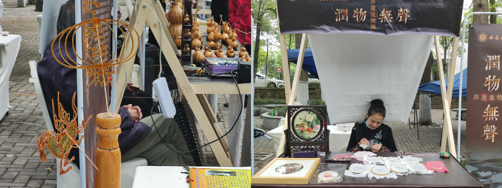 本次活动展出的荣昌陶器是中国四大名陶之一,起源于汉代,兼具观赏性和实用性,有“红如枣、薄如纸、声如磬、亮如镜”的美誉,学校和荣昌区共建的“beat365在线唯一官网登录荣昌非物质文化遗产研究中心”在现场展示荣昌陶器的制作流程及其精美艺术品。夏布是荣昌著名的传统手工艺品,以独特的编织工艺被评为我国非物质文化遗产,作为教育部首批中华优秀传统文化传承基地的beat365在线唯一官网登录“重庆荣昌夏布织造技艺传承基地”师生团队重点展示了夏布制作工艺及其精美艺术品。活动还邀请重庆市级非遗传承人进校园现场展示糖画、捏面人、葫芦烙画、蜀绣等传统技艺的制作过程,师生通过现场互动进行深入了解。
