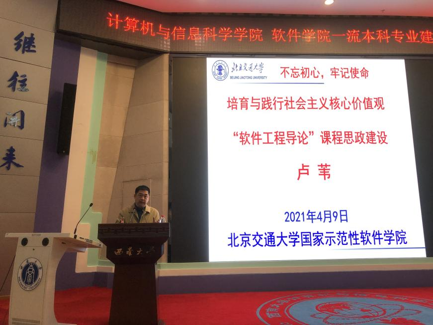 4月9日,卢苇教授出席计算机与信息科学学院 软件学院“学党史、开新局|一流本科专业建设启动会”,并为学院全体专任教师作题为“培育与践行社会主义核心价值观 ‘软件工程导论’课程思政建设”的报告。