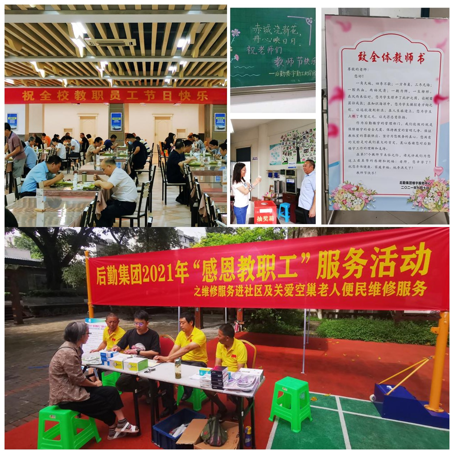 今年的教师节恰逢新生入学报到,在满足疫情防控要求、做好迎新服务保障的前提下,为将教师节活动办得贴心、丰富,学校后勤集团提前谋划、统筹安排,相关中心各司其职,协调配合,将教工餐厅赠饮活动、水电维修进社区及关爱空巢老人便民服务活动、“致敬与感恩”慰问活动、生活用品惠卖活动、恒温游泳馆优惠活动、桂园酒楼感恩回馈活动等6项活动逐一落实到位。