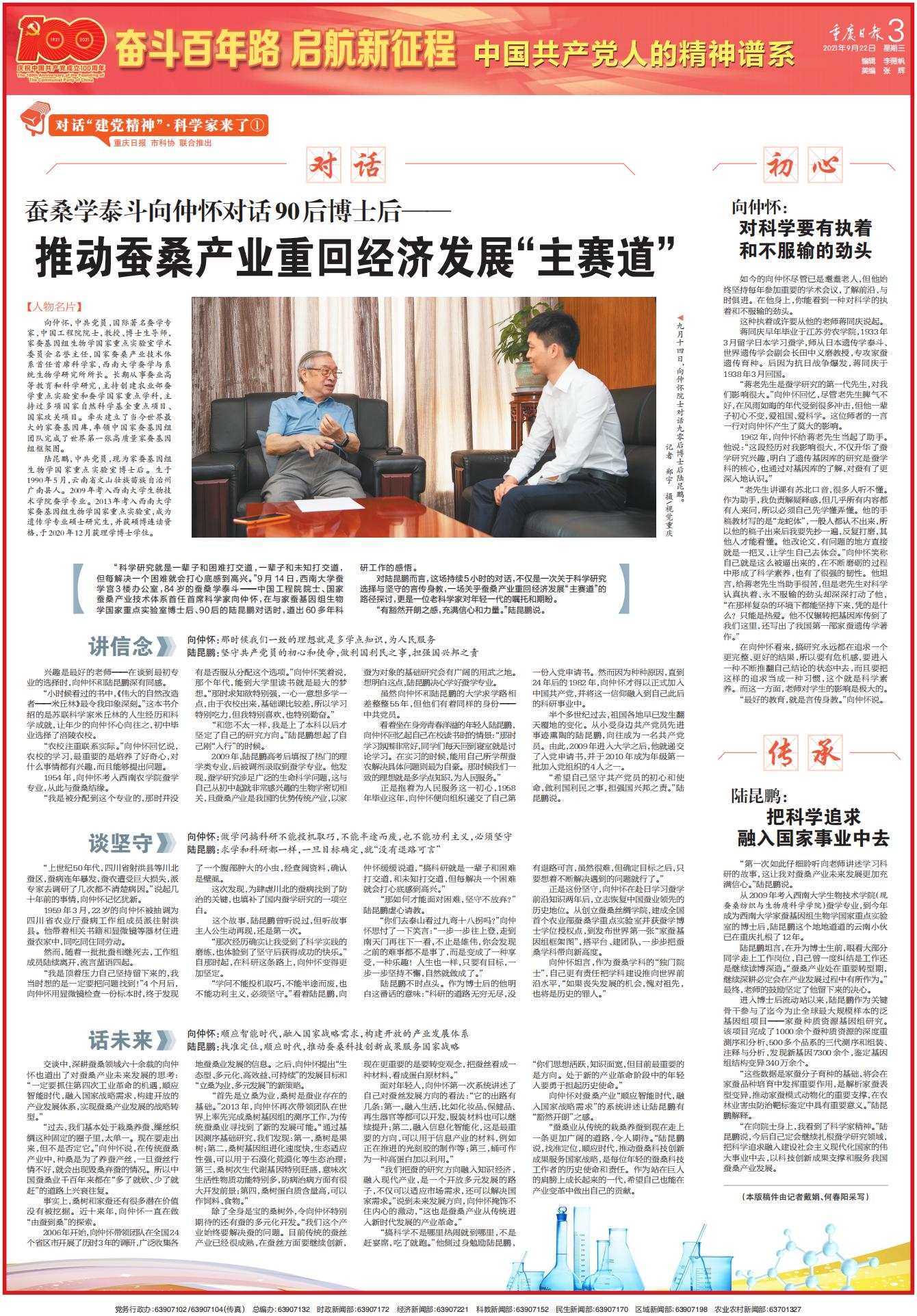 9月22日,重庆日报以“蚕桑学泰斗向仲怀对话90后博士后——推动蚕桑产业重回经济发展‘主赛道’”为题于第三版整版报道了学校向仲怀院士带领团队深耕蚕桑学科数十载,不断奋斗、不断创新、不断突破的历程和成就。此篇报道为重庆日报“奋斗百年路 启航新征程”特刊“对话‘建党精神’·科学家来了”专栏的开篇之作。