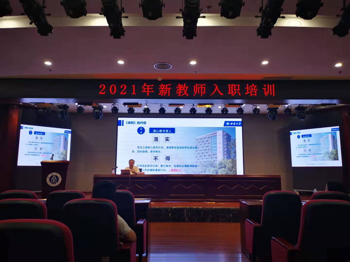 9月23日下午,学校在校史馆4楼报告厅组织2021年新进教师学习《新时代高校教师职业行为十项准则》(以下简称“十项准则”)专题讲座。讲座由学校党委副书记安春元讲授。