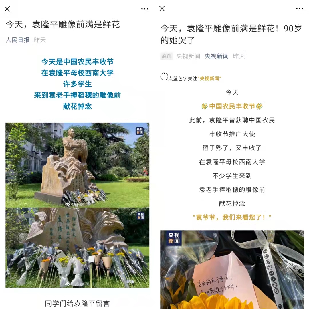 9月23日,学校袁隆平雕像前,出现了许多明信片和花束,过往师生路过时,都会停留致敬。央视新闻记者记录下了这感人一幕,央视新闻微信公众号头条报道学校师生缅怀纪念杰出校友袁隆平院士,并在全网掀起强烈反响和转载发布,人民日报、光明日报、中国青年报等众多国家级新媒体平台相继报道播发。