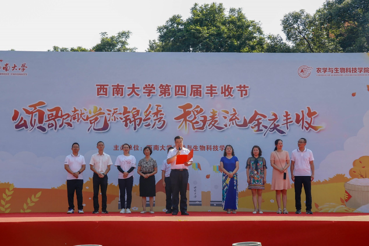 表演结束后,袁德胜致开幕词,他从国家政策趋势、重庆市农业发展状况、学校农业科技研究贡献等多角度发表讲话,袁德胜肯定beat365在线唯一官网登录、农学与生物科技学院在农科专业人才培养和农业发展方面所做出的努力并宣布学校第四届丰收节开幕。