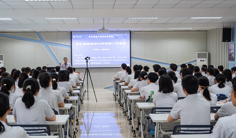陈时见非常重视本科拔尖创新人才培养工作,曾兼任含弘学院首任院长。在专题报告中,他基于自身的求学经历,总结大学学习的两个版本。1.0版本的大学是任务性学习,是由老师主导的按照学校的培养方案完成所有的课业学习,2.0版本的大学是除任务性学习以外,基于兴趣的自主性学习。大学期间要正确平衡任务性学习和兴趣性学习的关系,要善于抓住兴趣性学习的内容。他阐述含弘学院成立的初心:希望探索一条改变传统的以专业为主的教学模式,通过前两年的通识教育,让同学们探索喜欢的专业,将职业规划和学习兴趣、专业学习结合,达到基于综合、立于专业、归于个性的人才培养目标,培养一批心怀祖国,立足世界,立志将学习延伸到硕士和博士阶段学习的学生,培养一批在各行业领域有所成就的拔尖创新人才。陈时见强调,含弘学院是学校本科生拔尖创新人才的培养学院,学院提供优质学习资源和平台,希望同学们围绕未来国家需要的方向努力,珍惜学院的集体生活,相互帮助,相互关心,共同进步。
