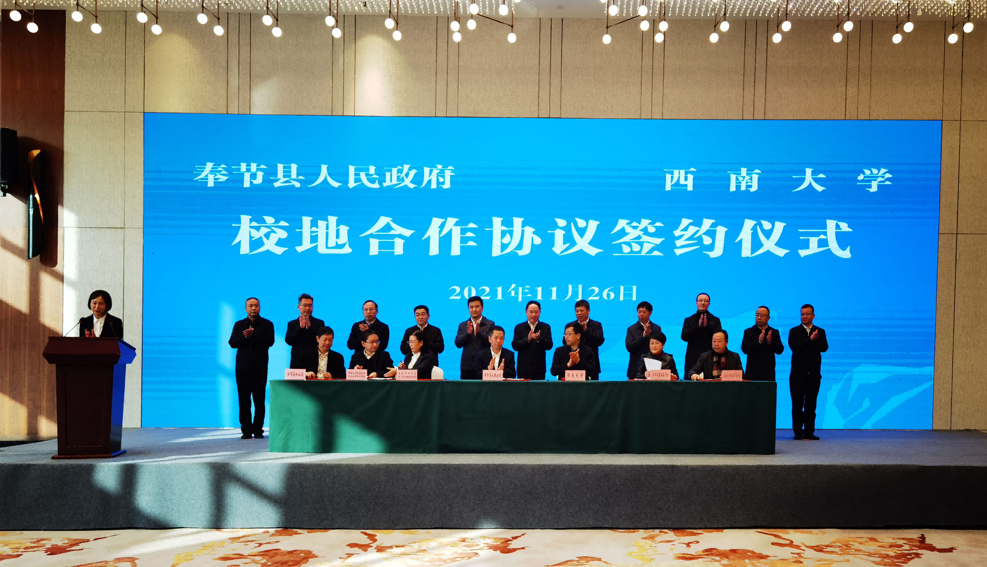 11月26日,校长张卫国前往奉节县参加校地合作签约仪式,副校长赵国华、相关单位负责人和专家陪同。奉节县委书记张果,县长巩义胜,县人大常委会主任田承毅,县政协主席向益平等县领导出席会议。