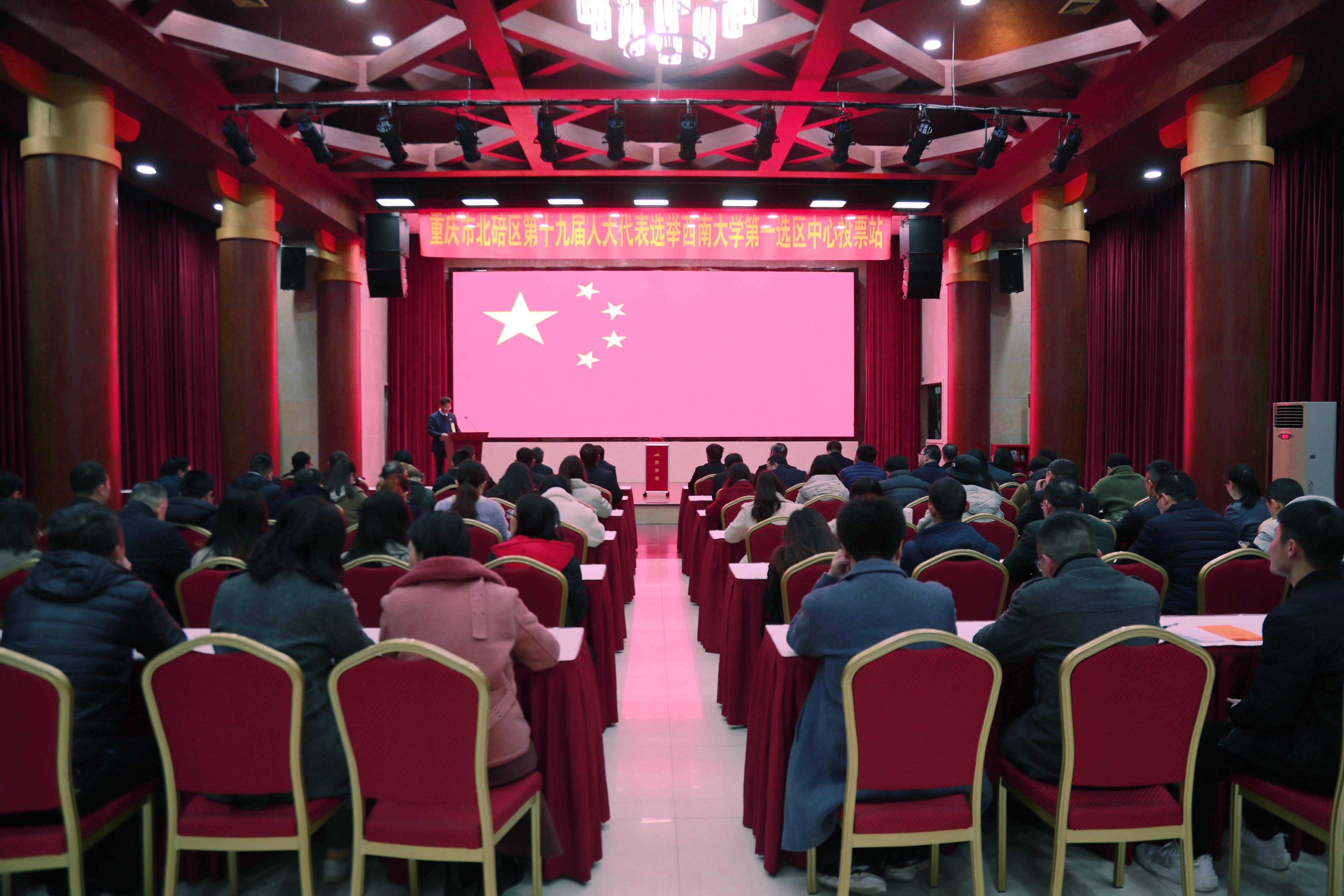 12月8日是重庆市北碚区第十九届人大代表选举投票日,作为北碚区的单设选举单位,早上8点,学校在东方红会议厅举行选举大会,并随后进行第一选区选举投票。全校选民按选区进行投票,选举工作顺利进行。