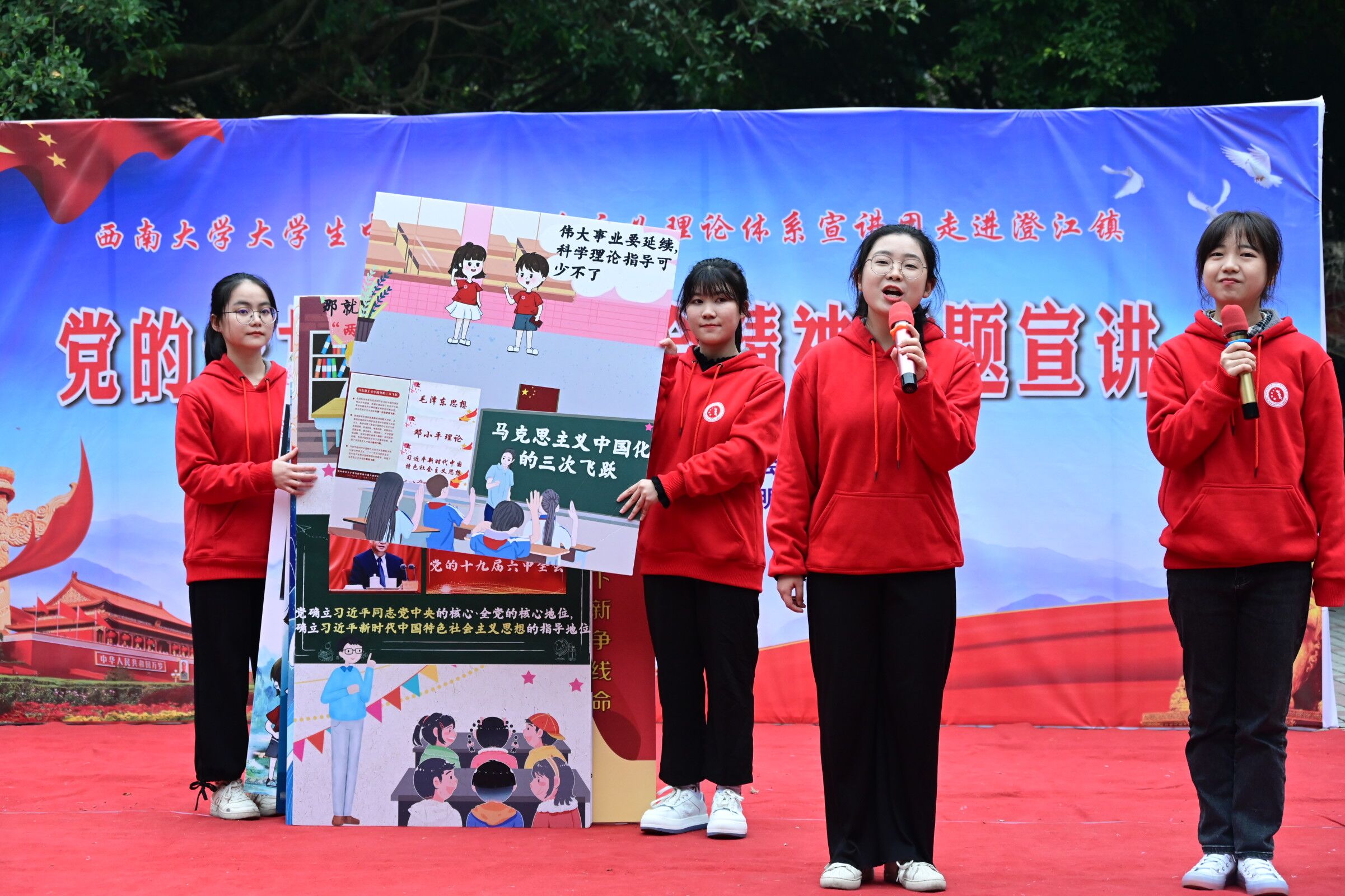 12月10日下午,学校大学生中国特色社会主义理论体系宣讲团走进重庆市北碚区澄江镇,为镇上近百名群众宣讲党的十九届六中全会精神。宣讲员们用生动活泼的快板舞和图说18张党的十九届六中全会精神的原创漫画,带来了这场兼具知识性与趣味性的宣讲活动。