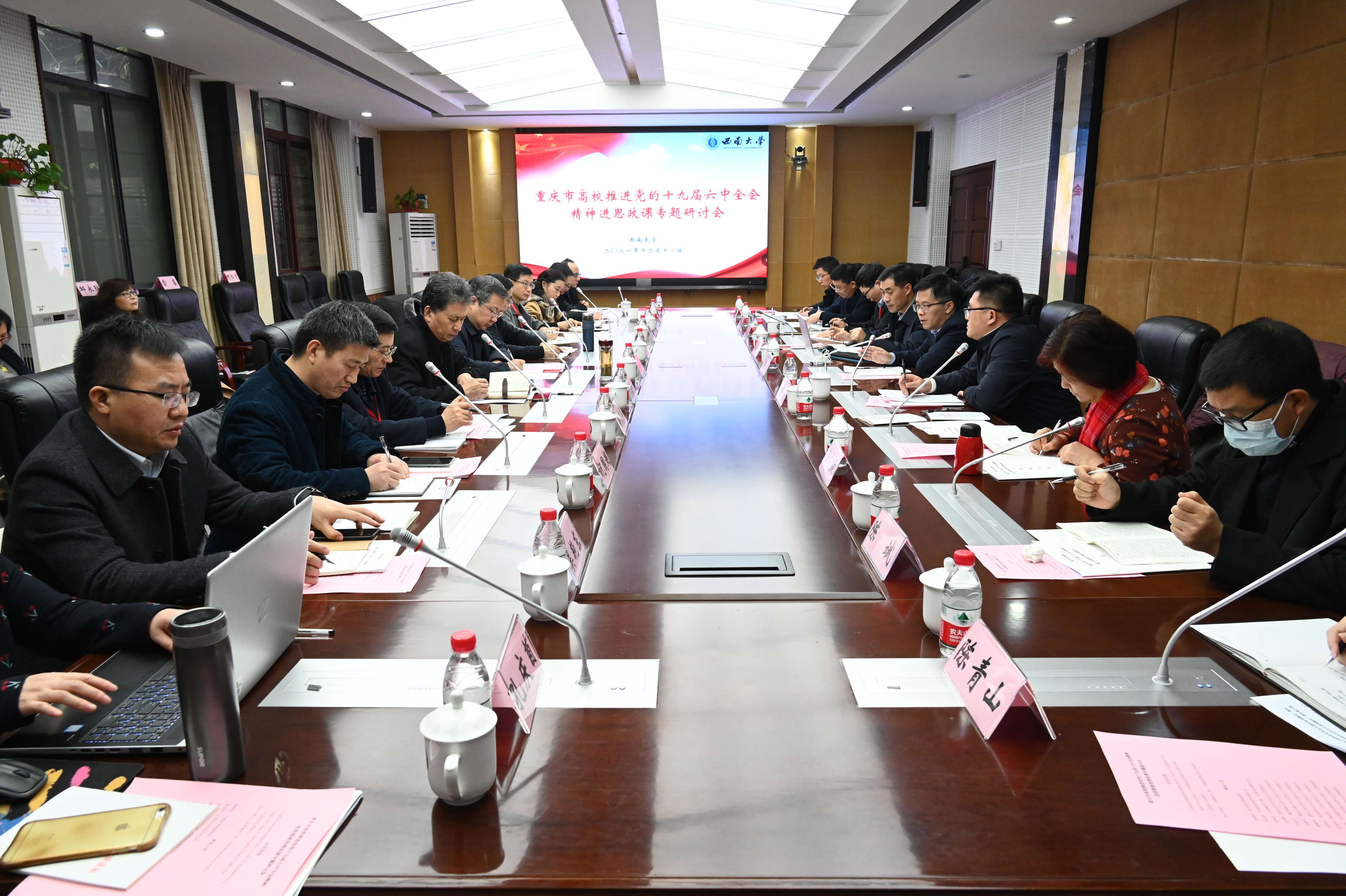 12月11日上午,重庆市高校推进党的十九届六中全会精神进思想政治理论课专题研讨会在学校马克思主义学院举行。市委宣传部副部长曾维伦,市委教育工委、市教委宣教处处长李林齐出席研讨会。重庆大学、beat365在线唯一官网登录、重庆市委党校、西南政法大学、四川外国语大学、重庆师范大学、重庆邮电大学、重庆交通大学、重庆工商大学、重庆医科大学、重庆理工大学、四川美术学院、重庆科技学院、长江师范学院、重庆三峡学院、重庆第二师范学院、重庆城市管理职业学院17所高校马克思主义学院主要领导参加此次研讨,研讨会由李林齐主持。
